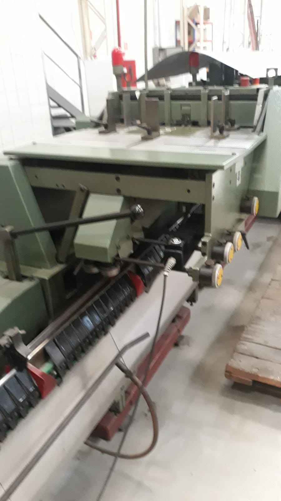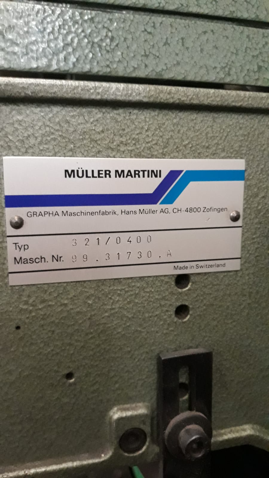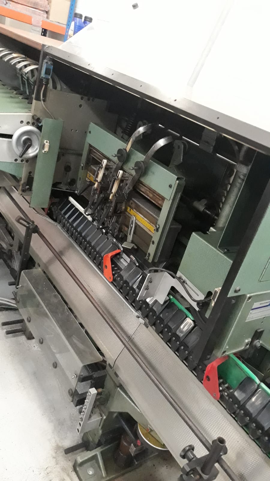 Alceadeira e grampeadeira usada, marca Muller Martini, modelo 321, ano 1998, 6 estações de alceamento, alimentador de capas, 2 grampeadores e trilateral na saída.