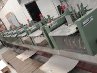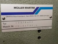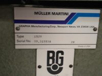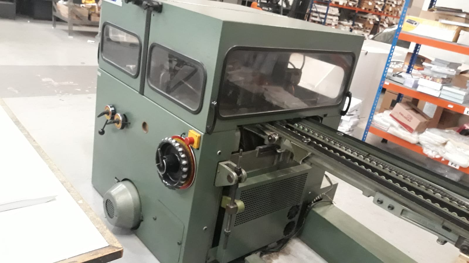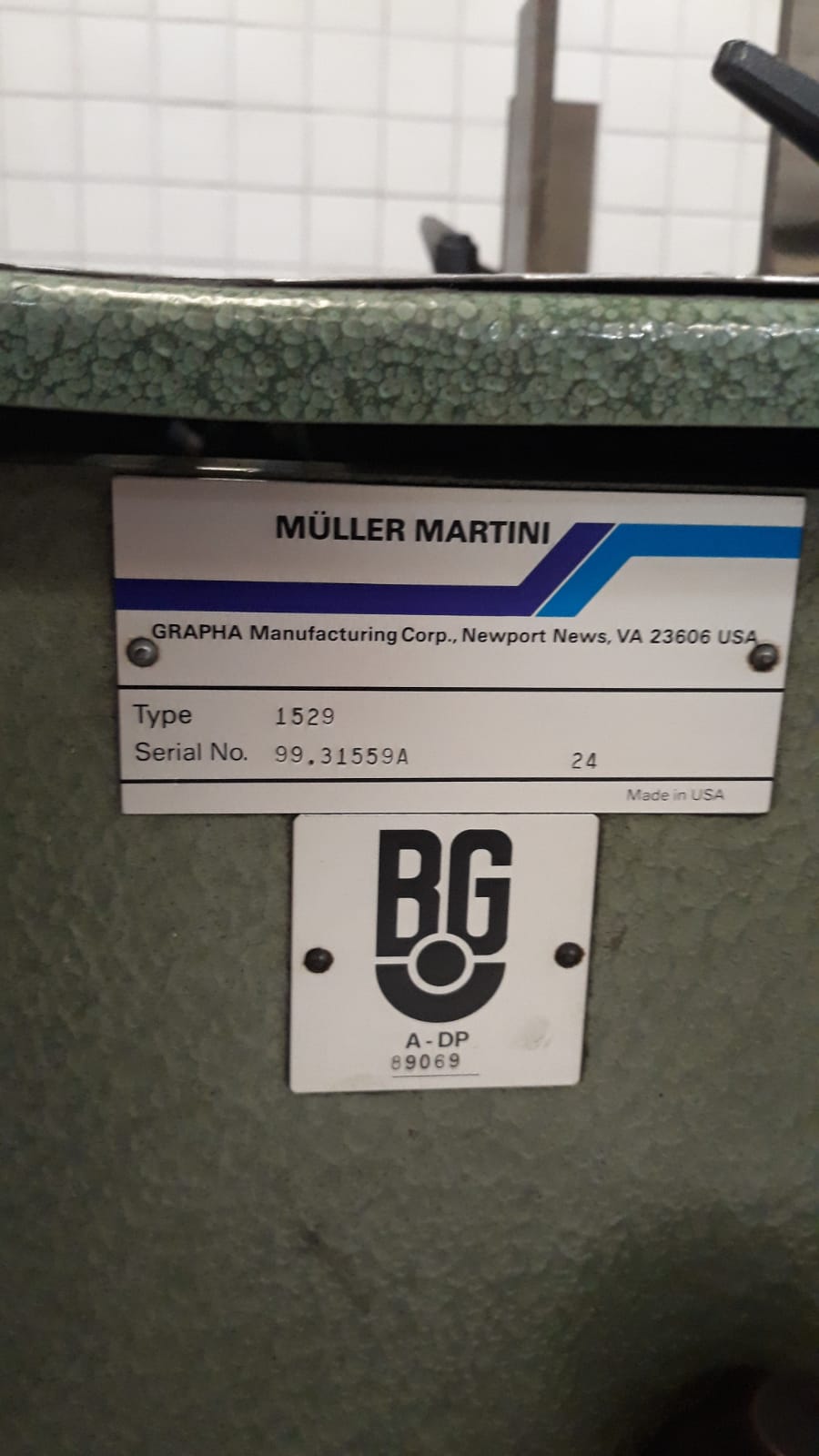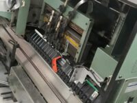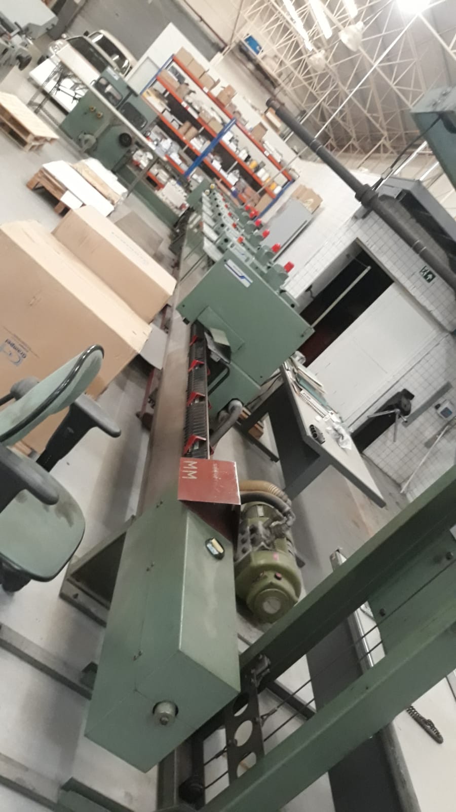 Alceadeira e grampeadeira usada, marca Muller Martini, modelo 321, ano 1998, 6 estações de alceamento, alimentador de capas, 2 grampeadores e trilateral na saída.