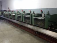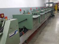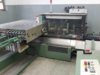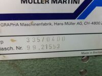 Alceadeira e grampeadeira usada, marca Muller Martini, modelo 335, ano 1992, com 8 estações de alceamento de cadernos, formato máximo 480 x 320 mm, alimentador de capas, 2 grampeadores, trilateral, com os seguintes diferenciais: