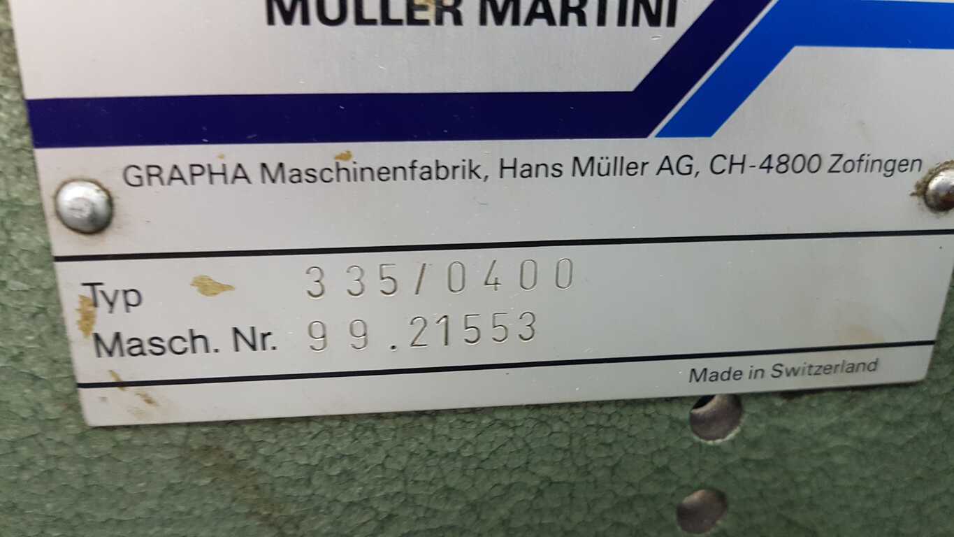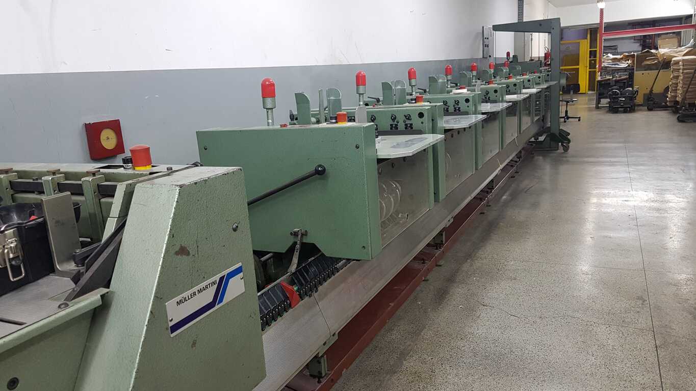 Alceadeira e grampeadeira usada, marca Muller Martini, modelo 335, ano 1992, com 8 estações de alceamento de cadernos, formato máximo 480 x 320 mm, alimentador de capas, 2 grampeadores, trilateral, com os seguintes diferenciais: