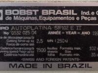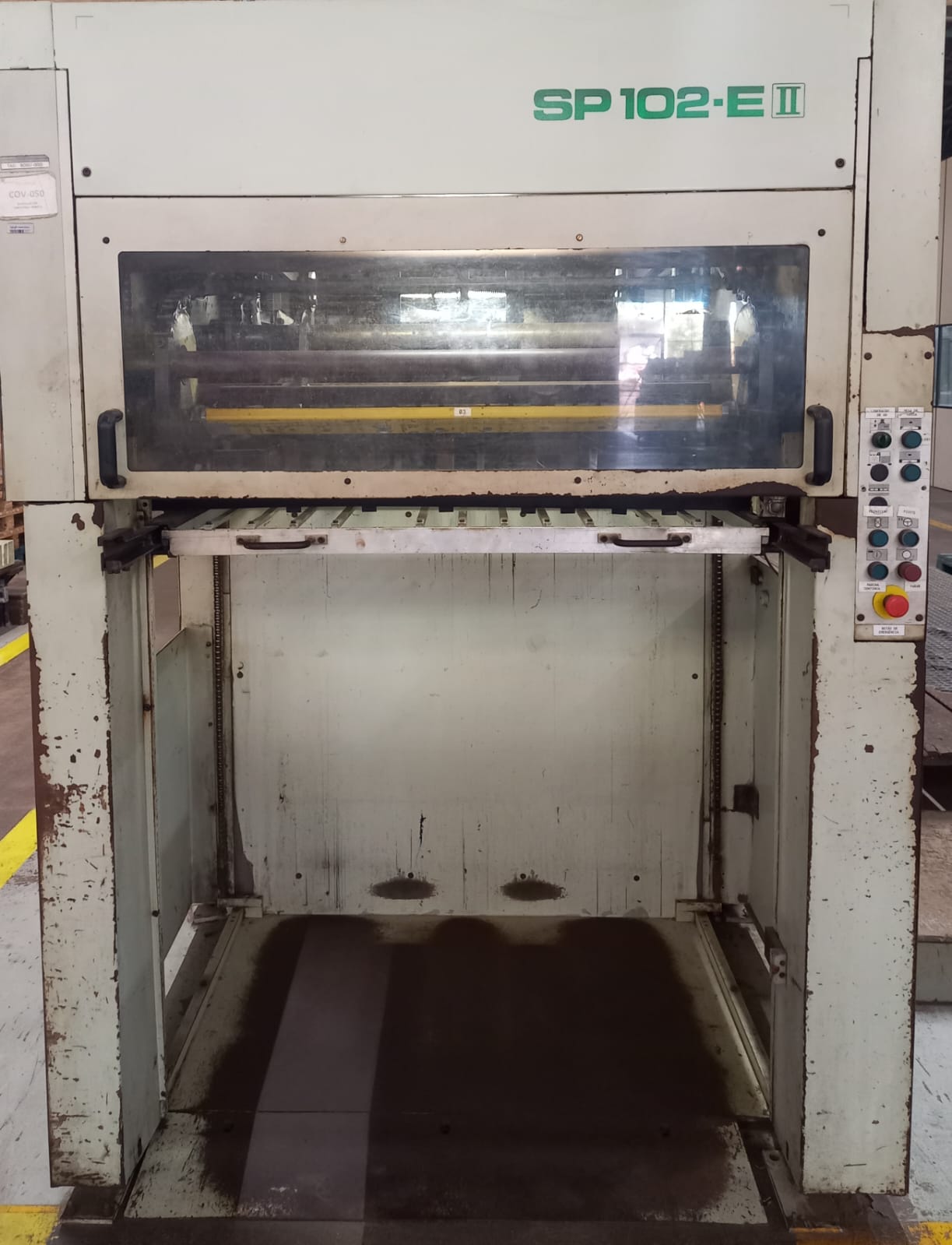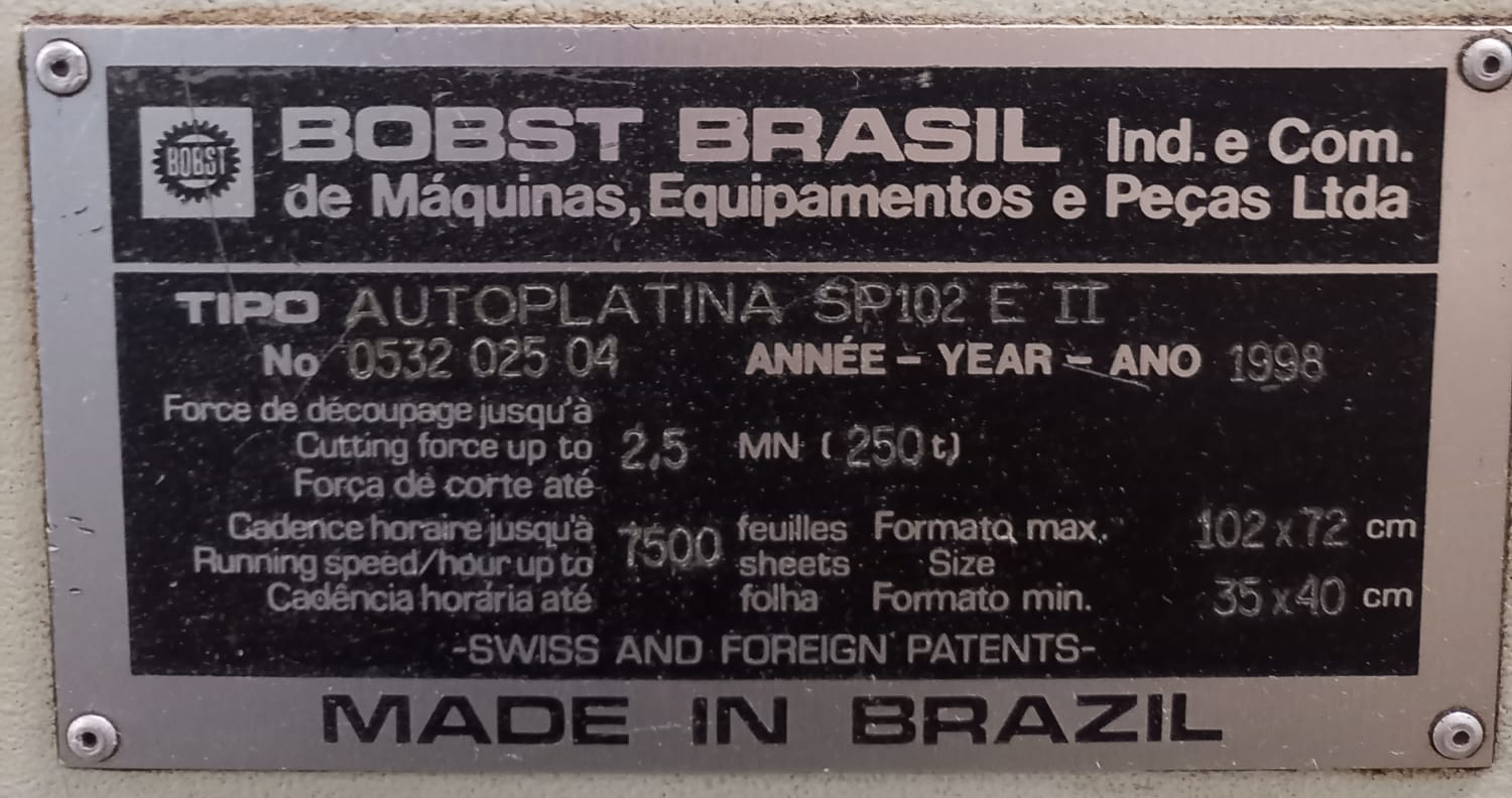 Corte e Vinco Automática usada, marca Bobst, modelo SP 102 E II, ano 1998, formato 72 x 102 cm, velocidade máxima 7.500 FPH, equipada com destaque, em produção.