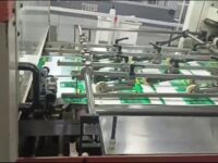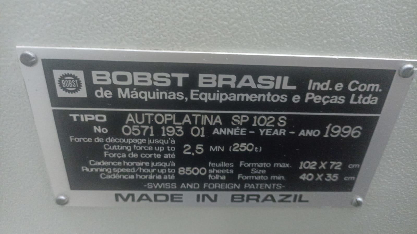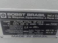 Corte e Vinco Automática usada, marca Bobst, modelo SP 102 S, ano 1996, formato 72 x 102 cm, velocidade máxima 7.500 FPH, equipada com destaque, em produção.