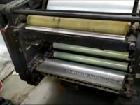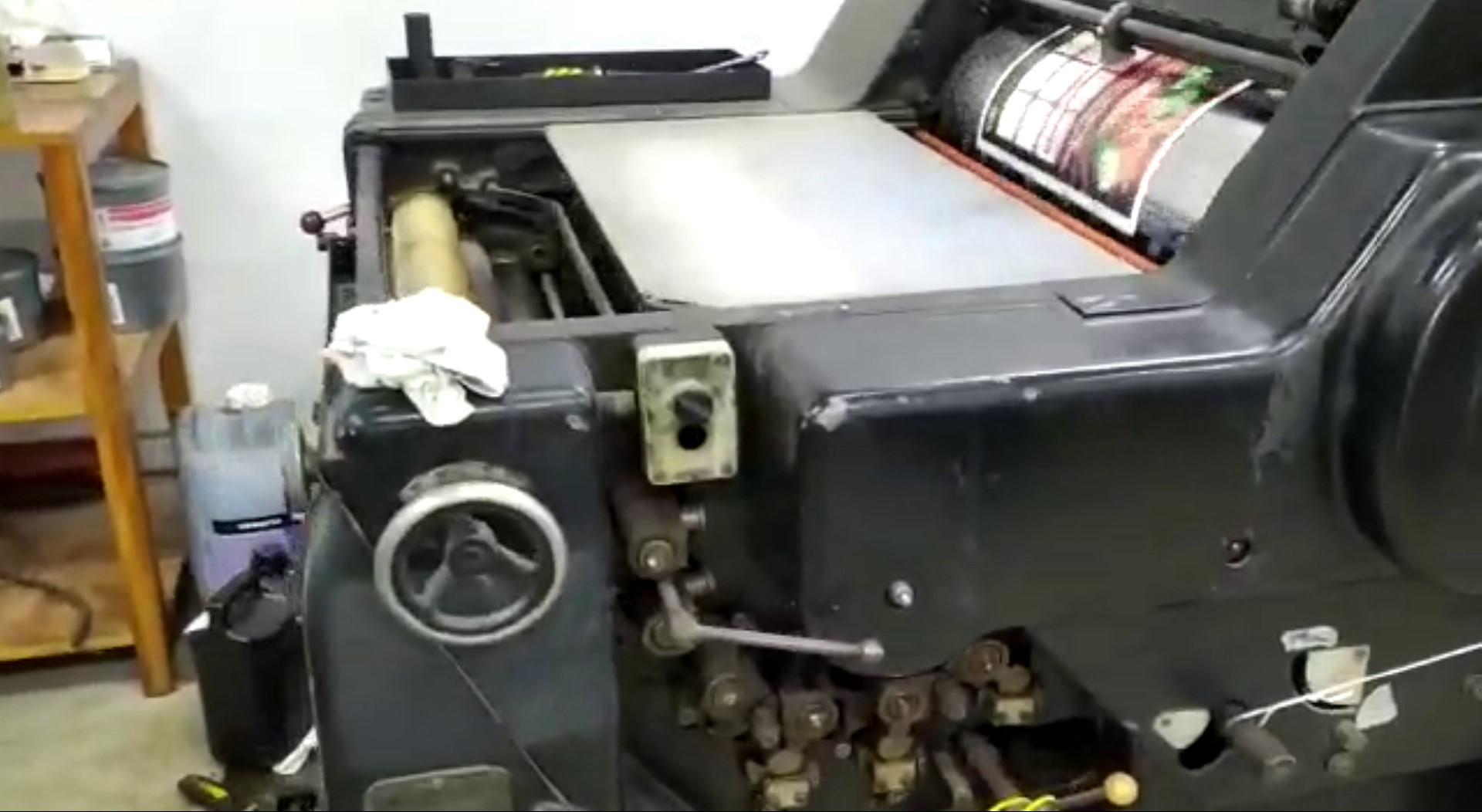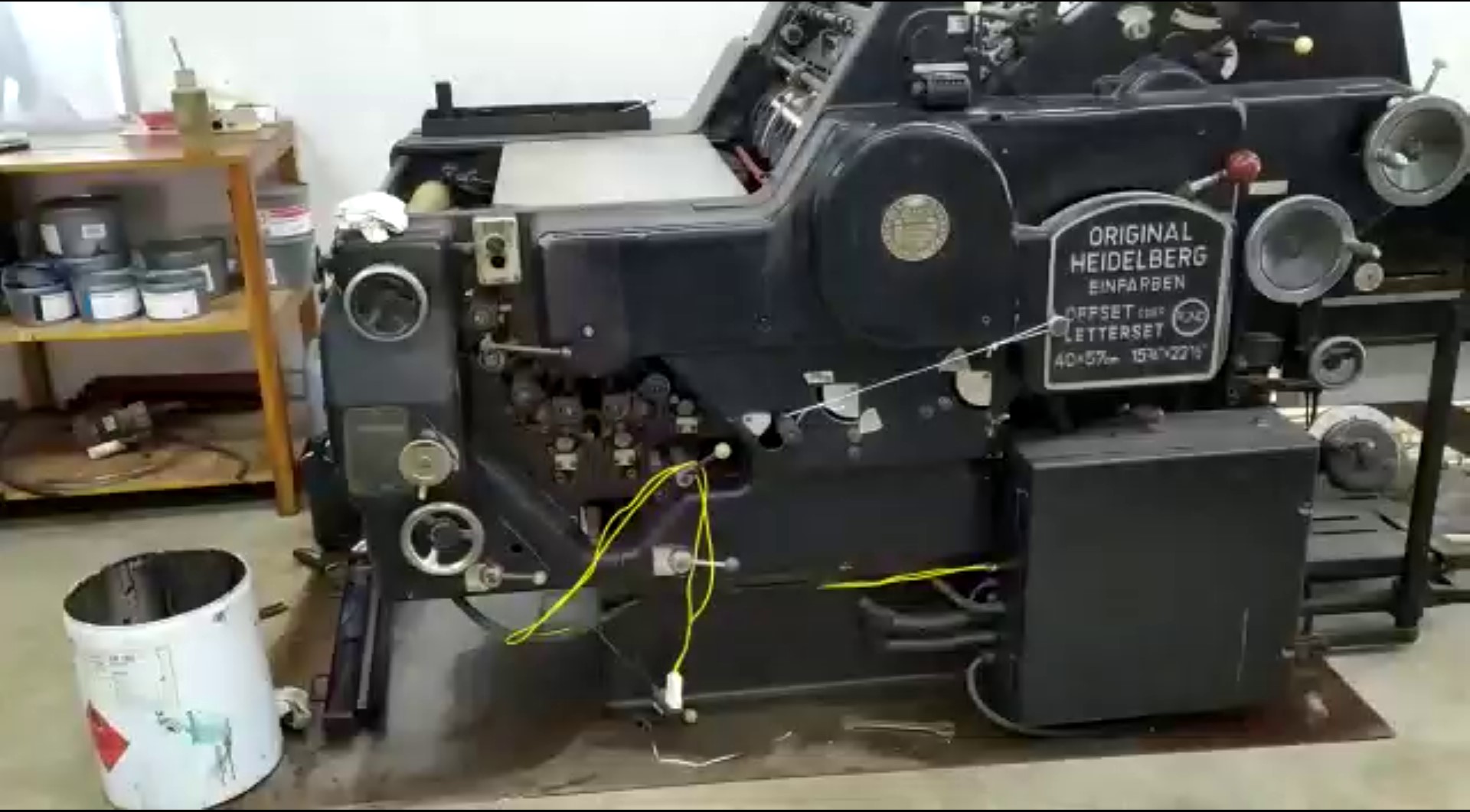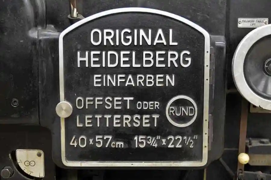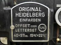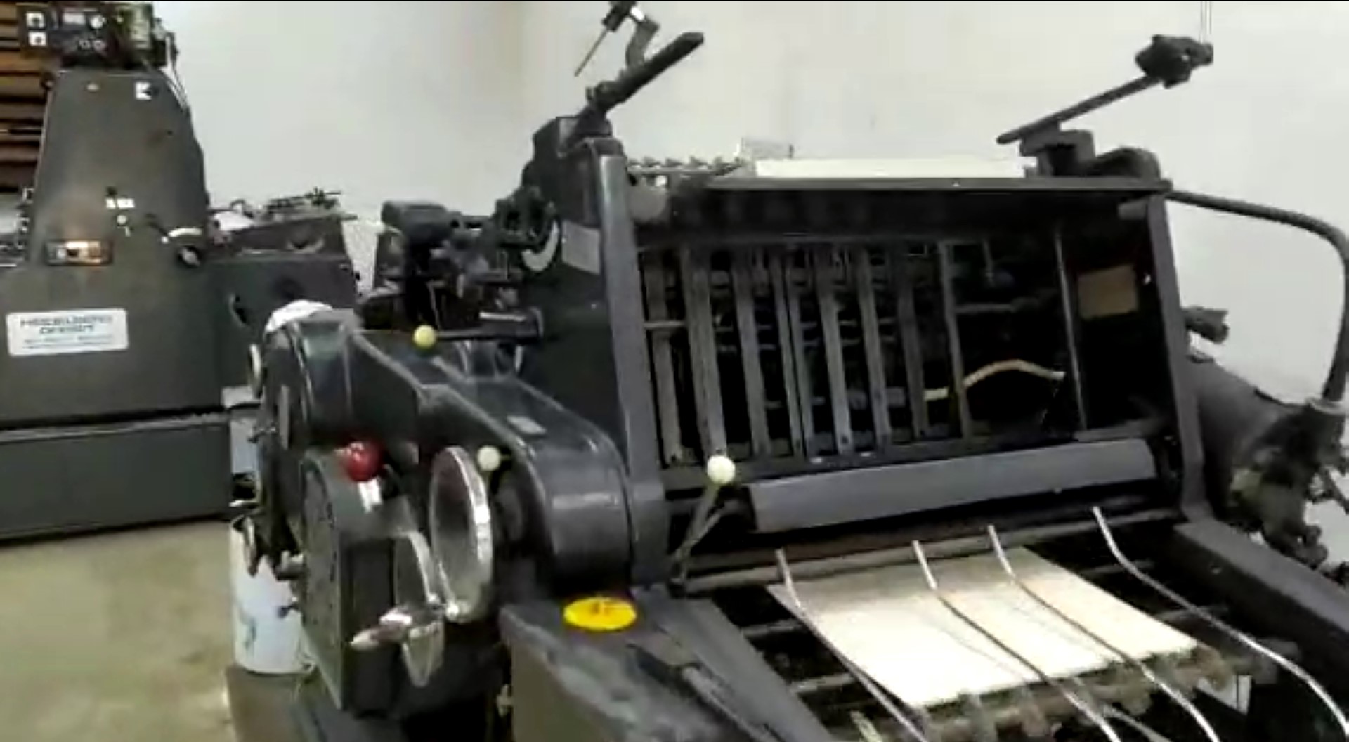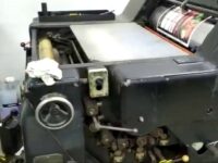 Corte e vinco Heidelberg Einfarben Offset Letterset, anos 60, formato 40 x 57 cm, rolaria UV, adaptada para verniz UV, com forno Bally de 80 cm de largura, 2 lâmpadas e esteira comprida.