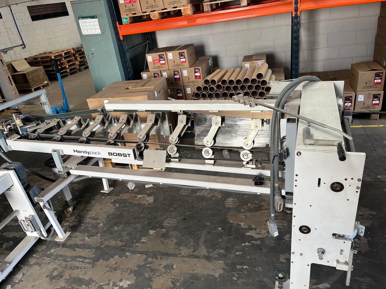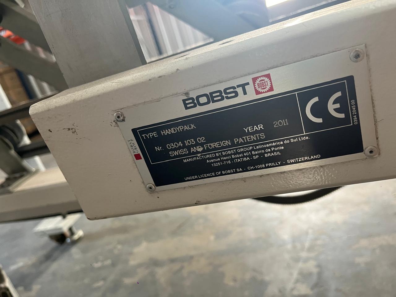 Empacotador de cartuchos usada, marca Bobst, modelo Handpack, ano 2011, para adaptar na saída da cartucheira, com design modular, configuração rápida e montado em rodízio para facilitar o deslocamento. Facilita aumentando a produtividade no empacotamento em caixas no final do processo.