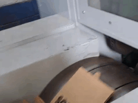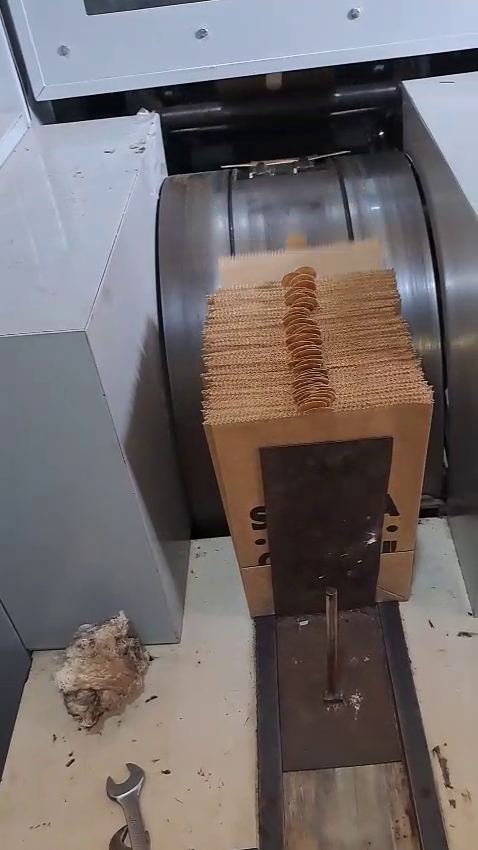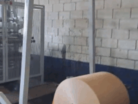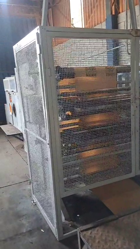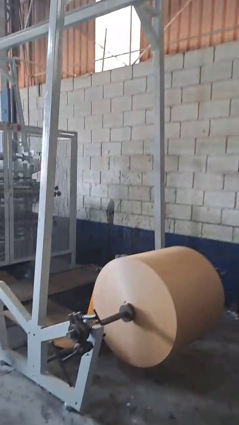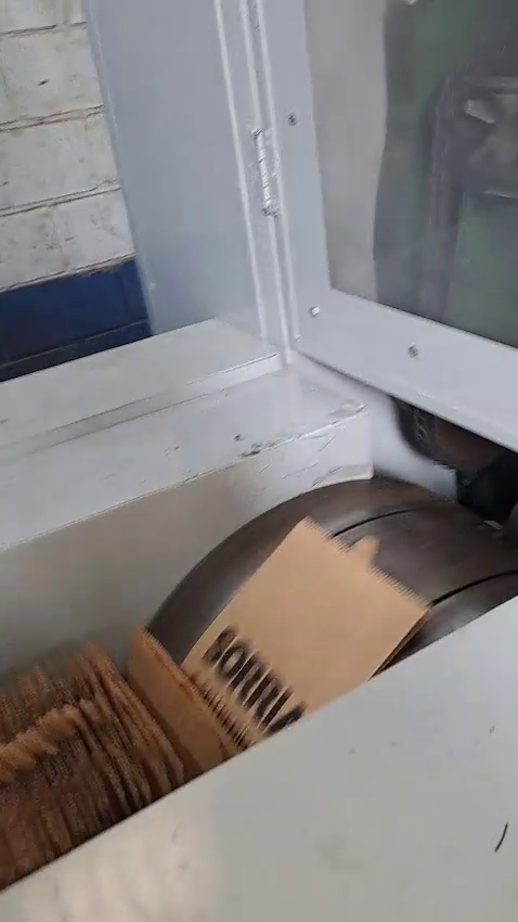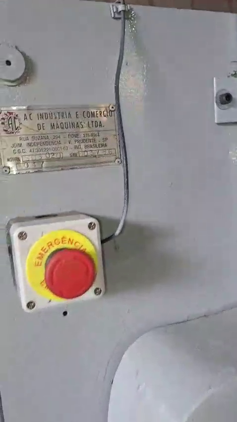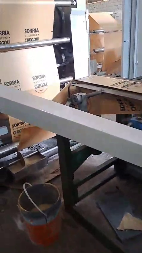 Fechadora de sacos de fundo quadrado SOS 020, marca AC, pega chapas de 18 a 28 cm, com 3 cores, em produção.