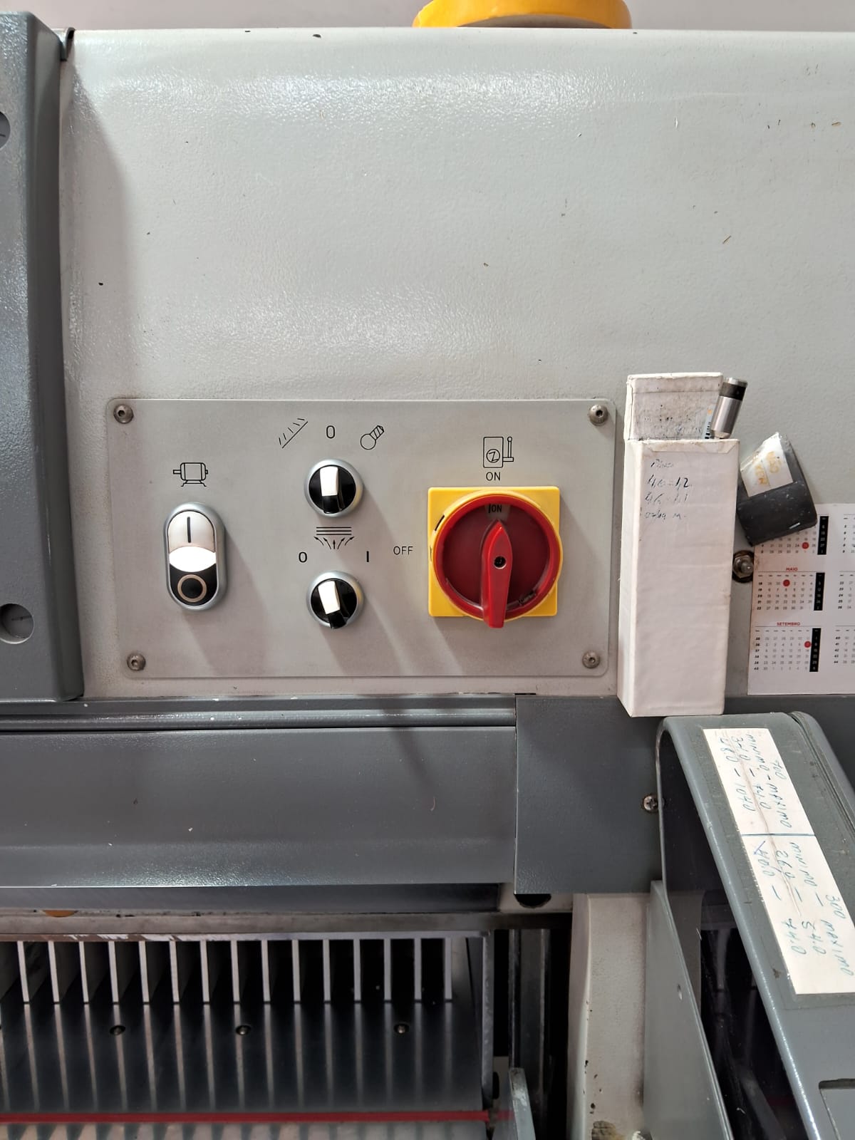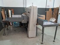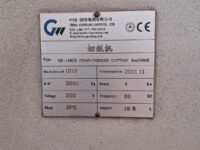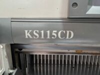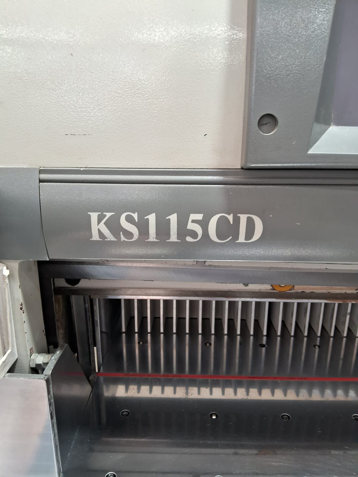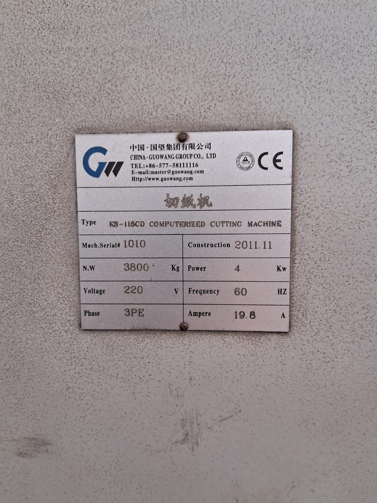 Guilhotina linear usada, marca Guowang, modelo KS 115 CD, ano 2011, formato 115 cm de boca, programação com monitor LCD colorido, mesa de inox longa, colchão de ar, fotocélulas, em produção.