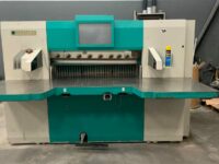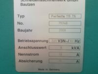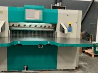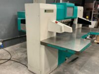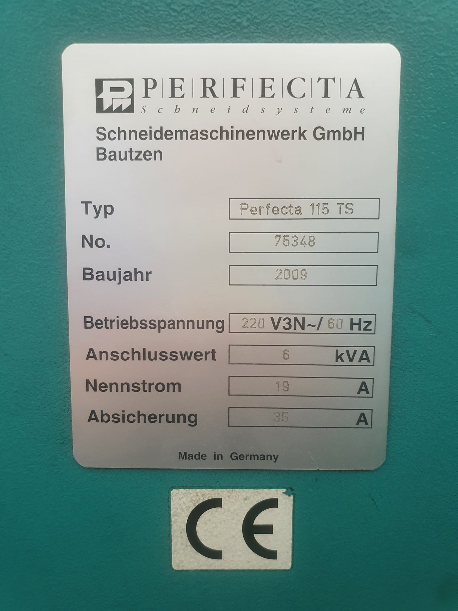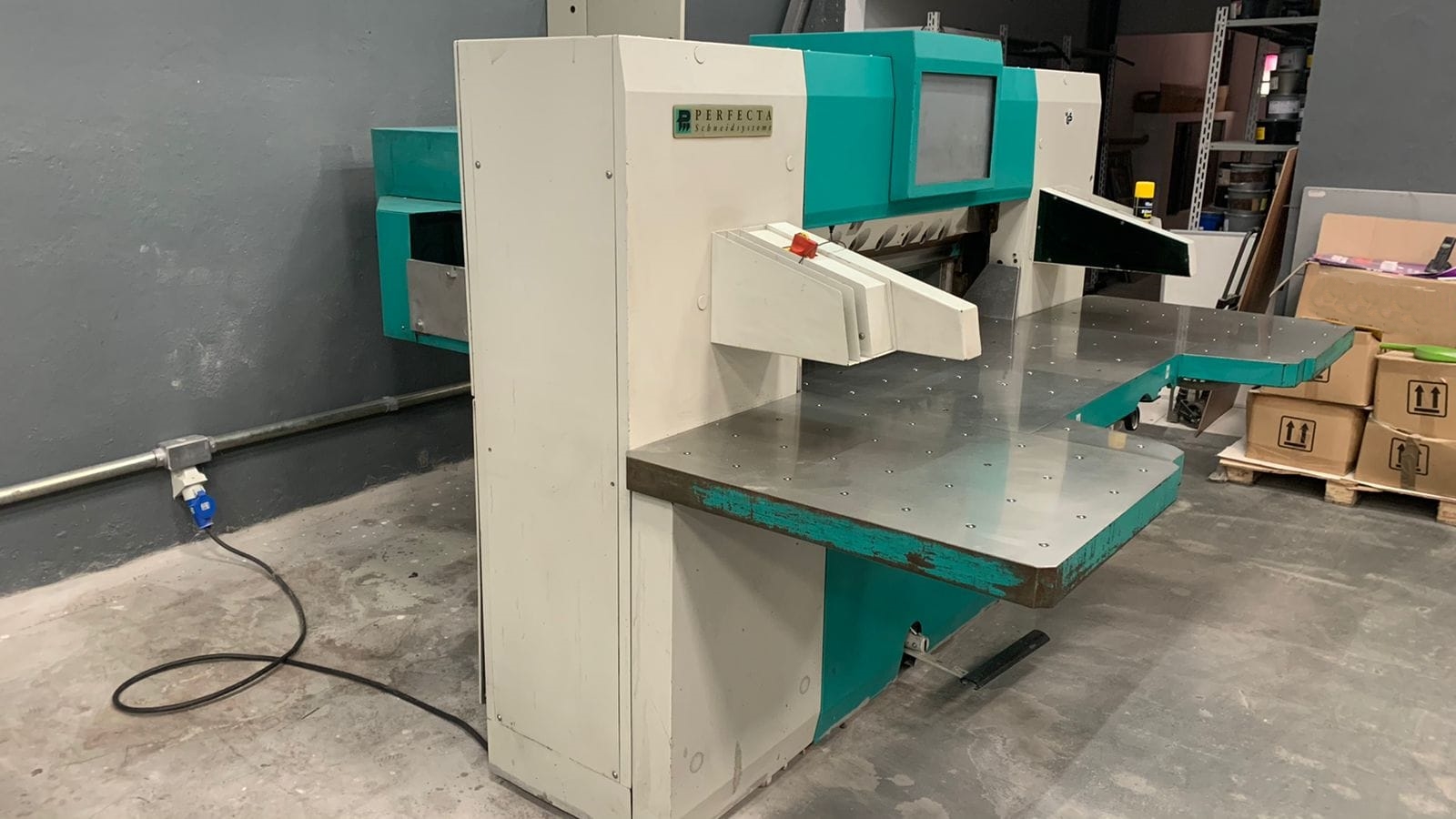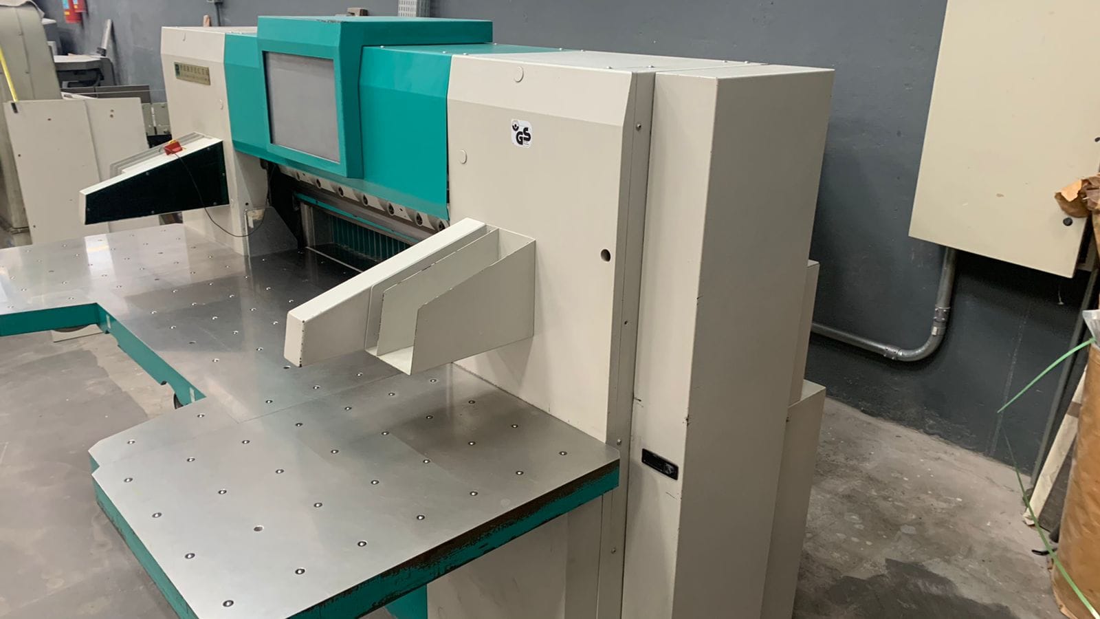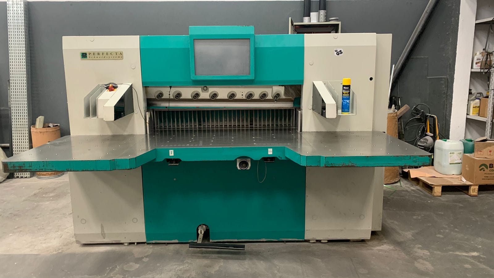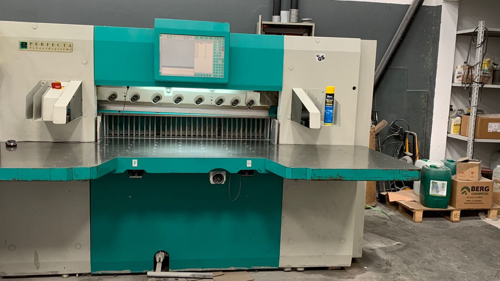 Guilhotina linear usada, marca Perfecta, modelo 115 TS, ano 2009, 115 cm de boca, com programação original, monitor colorido, mesa longa, colchão de ar, colchão de ar, fotocélulas, em perfeito estado.