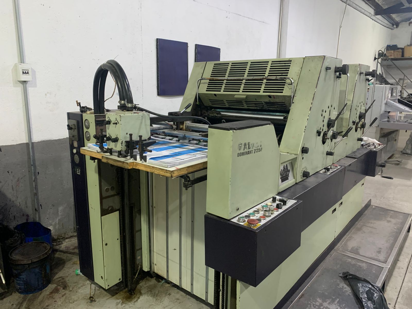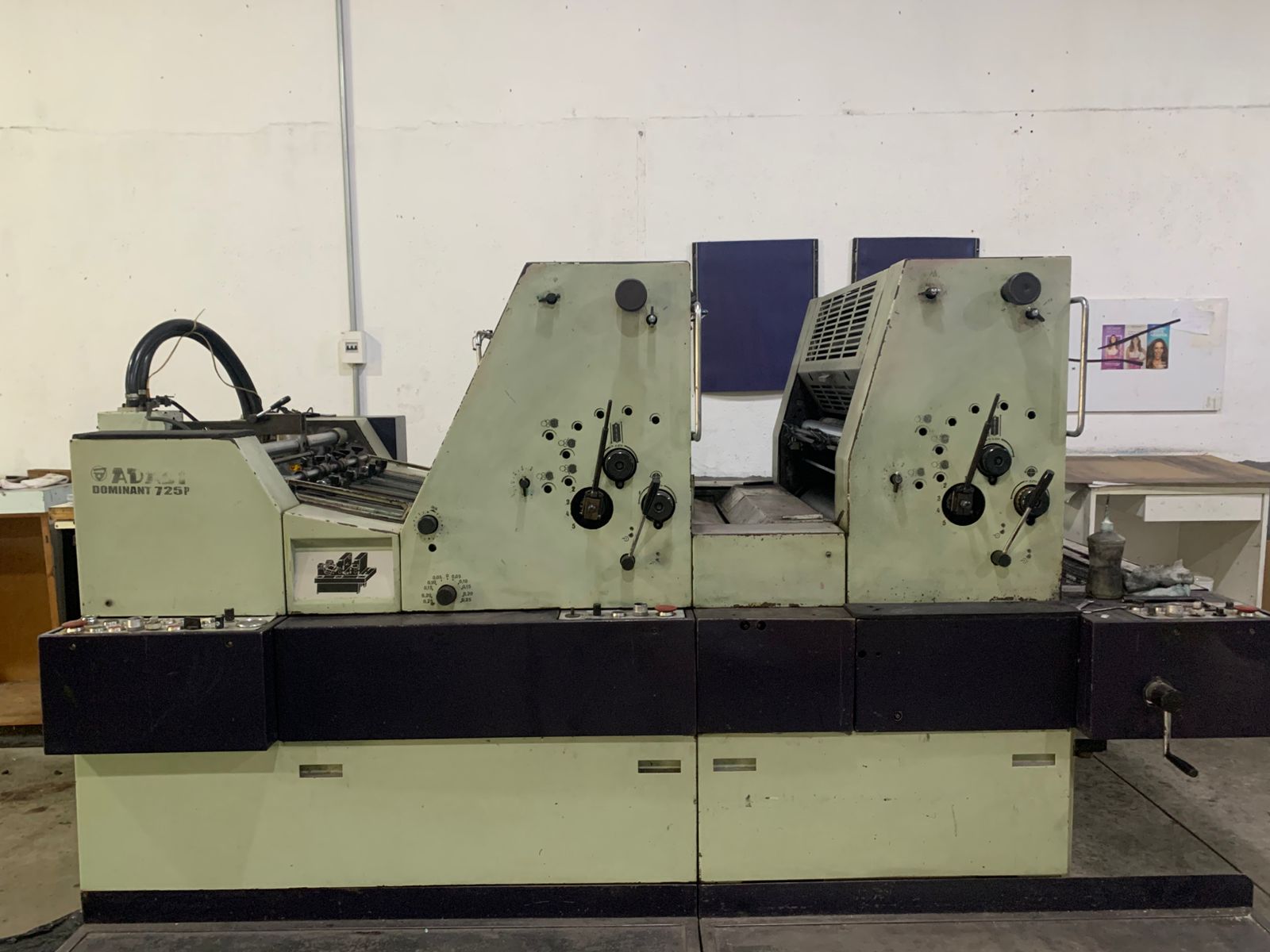 Impressora offset usada, marca Adast, modelo 725 P, ano 1996, bicolor, formato 48 x 66 cm, molha convencional, reversão, em produção.