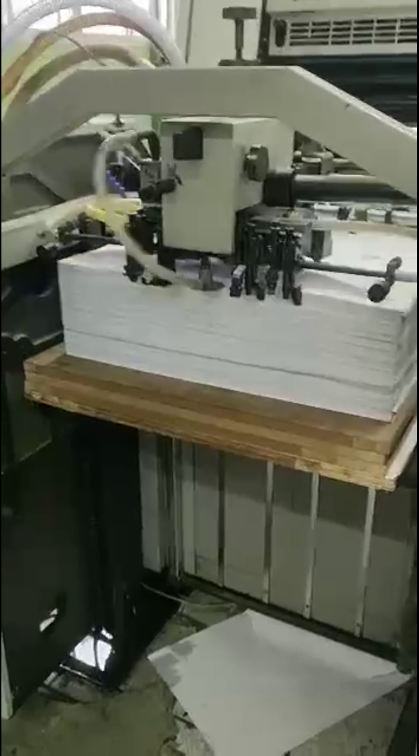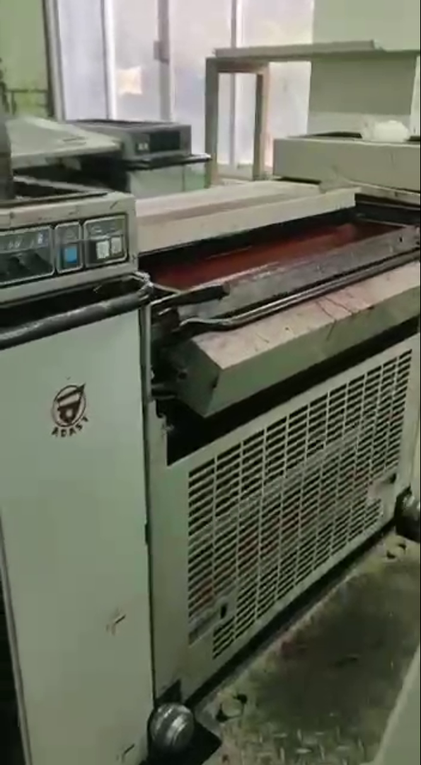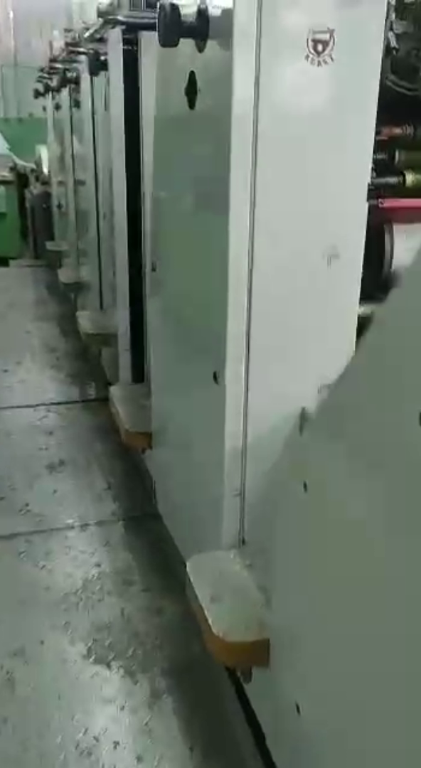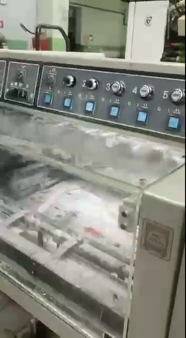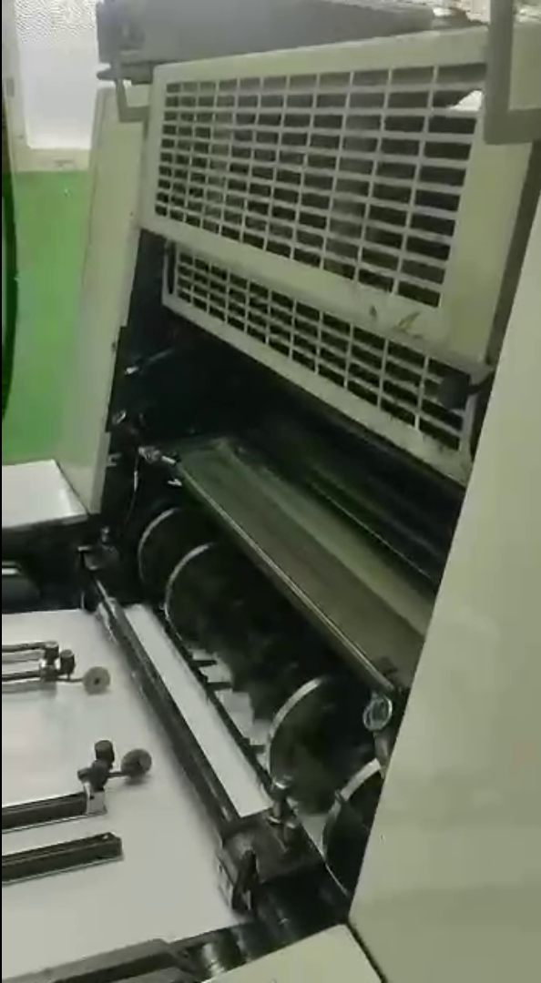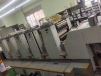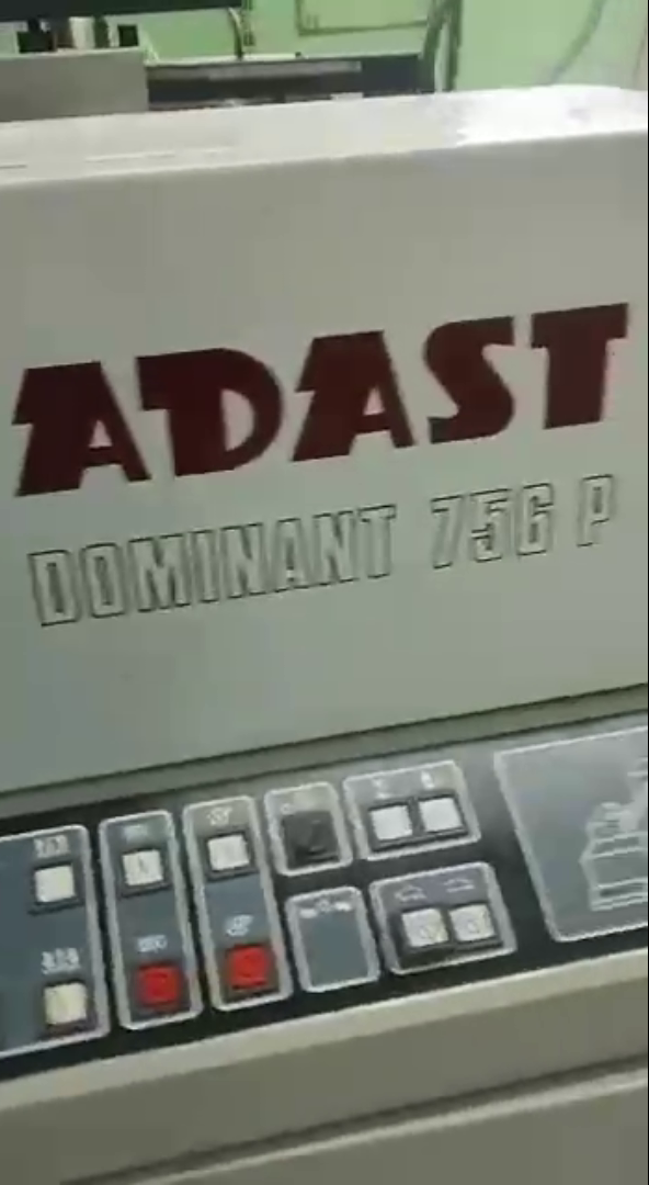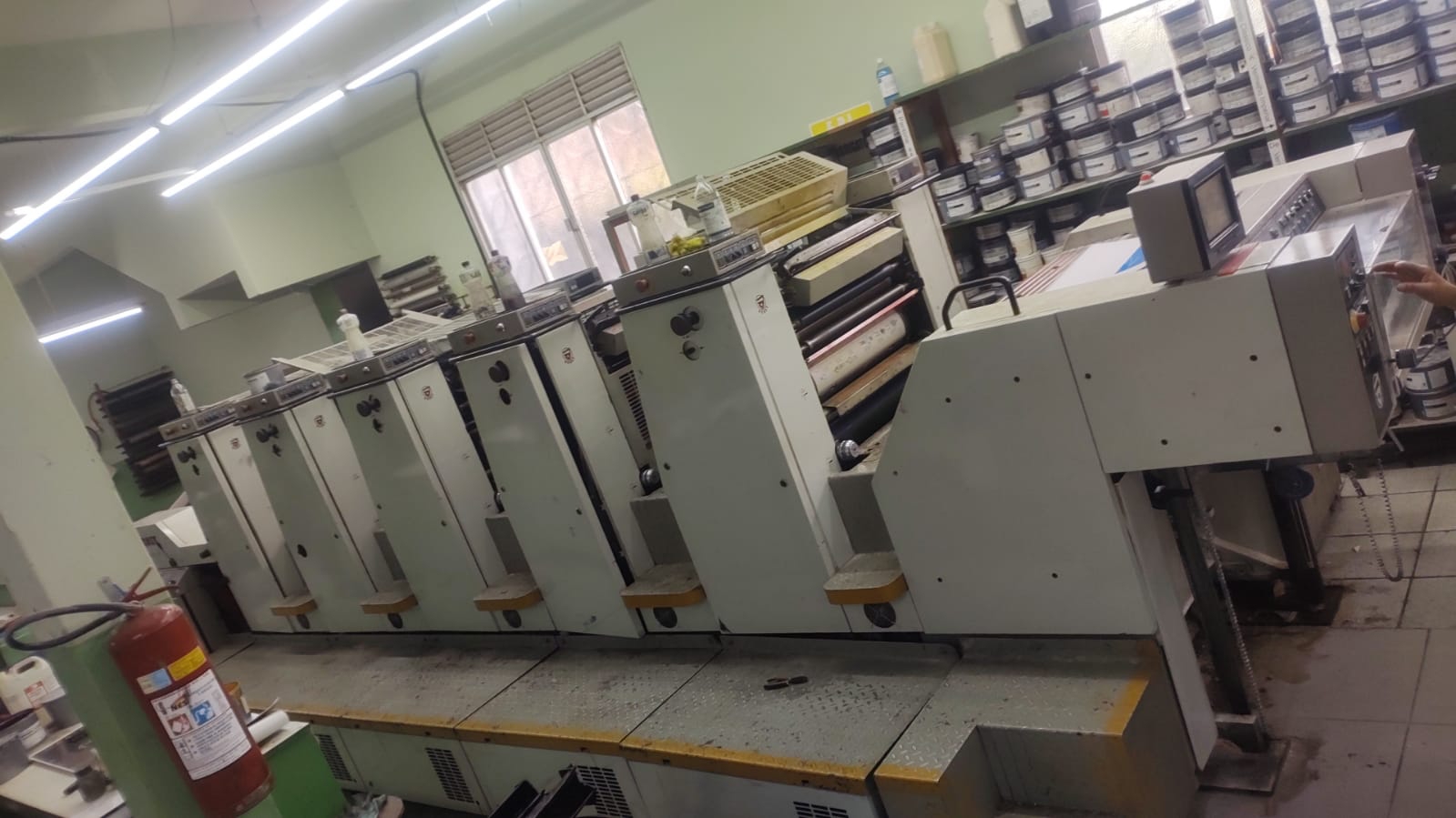 Impressora offset usada, marca Adast, modelo Dominant 756, ano 1997, 5 cores, formato 48 x 66 cm, equipada com console de comandos de tinteiros e registros, molha à álcool, secador IR, pilha alta, reversão 1/4.