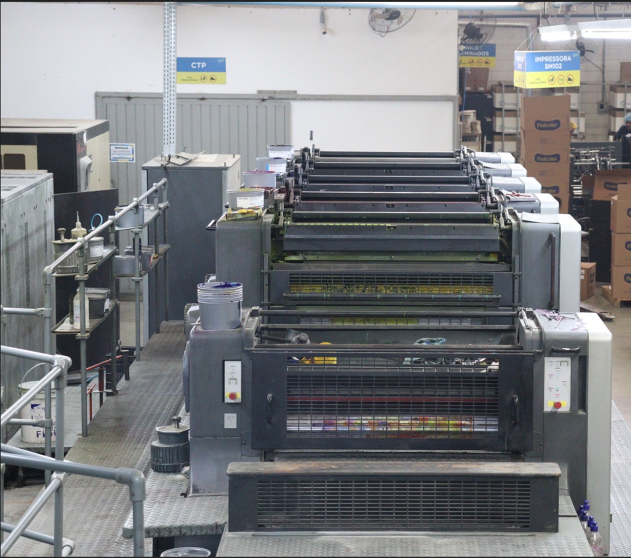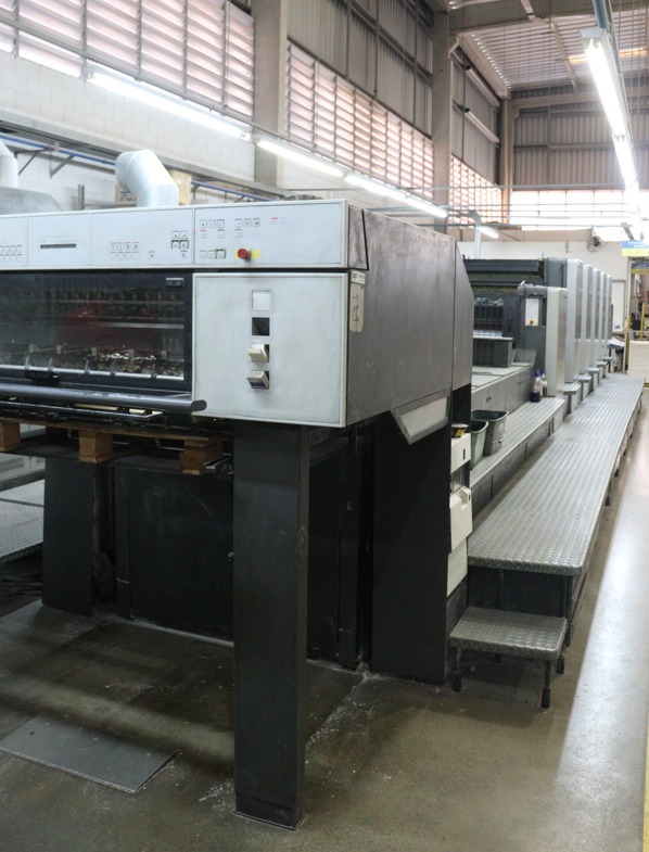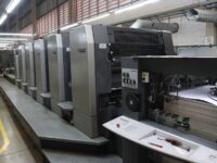 Impressora offset usada, marca Heidelberg, modelo sm 102-5 P+LX, ano 2001, 5 cores + unidade de verniz, formato 72 x 102 cm, equipada com CP2000, Autoplate, verniz com cilindro Anilox, CIP3, Controle de temperatura dos rolos de tinta, secador IR, lavadores automáticos, reversão 2/3, saída longa, em produção.
