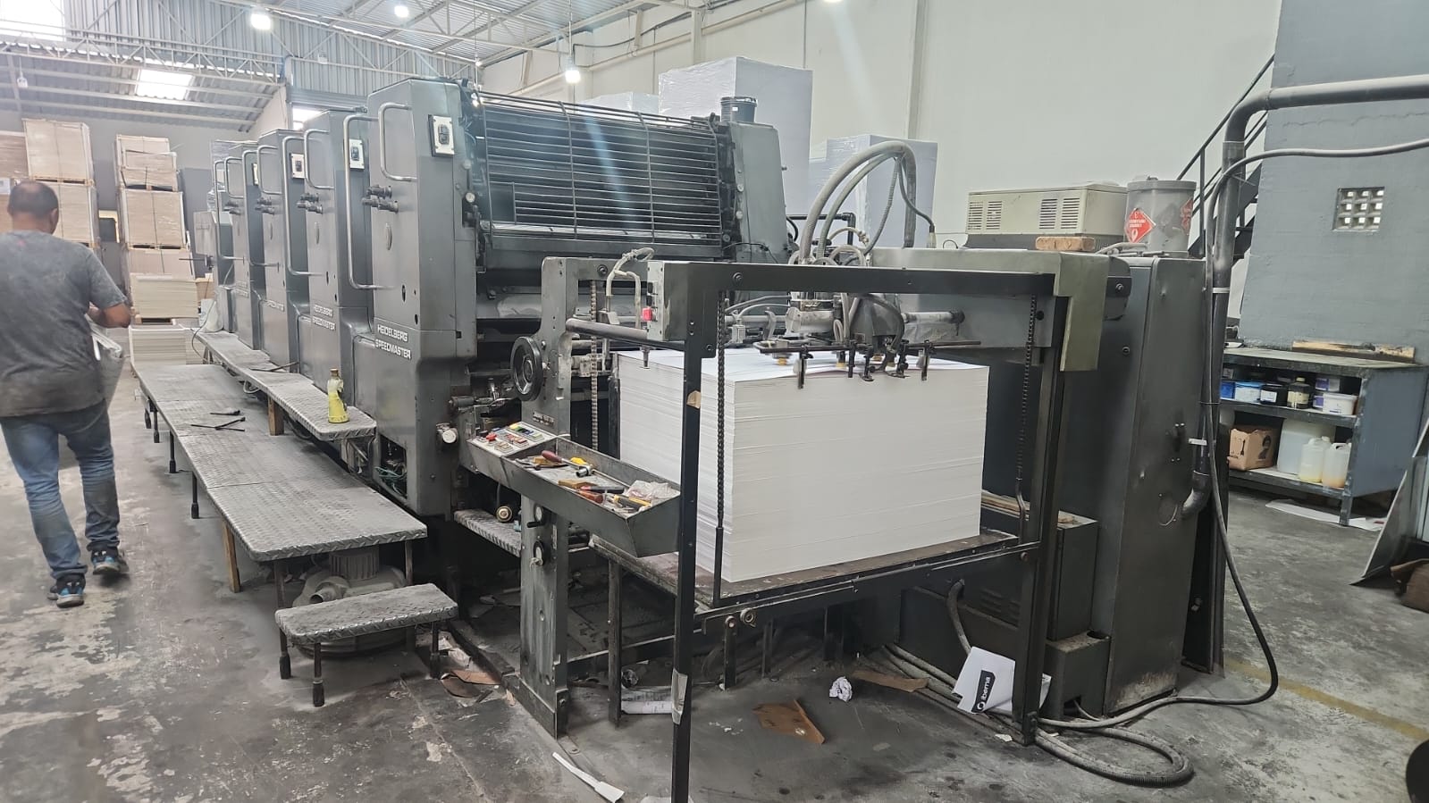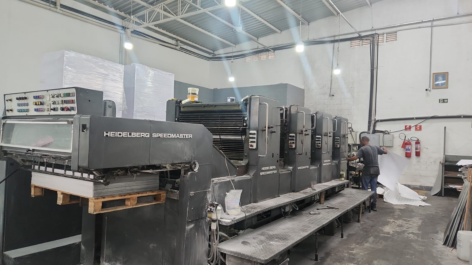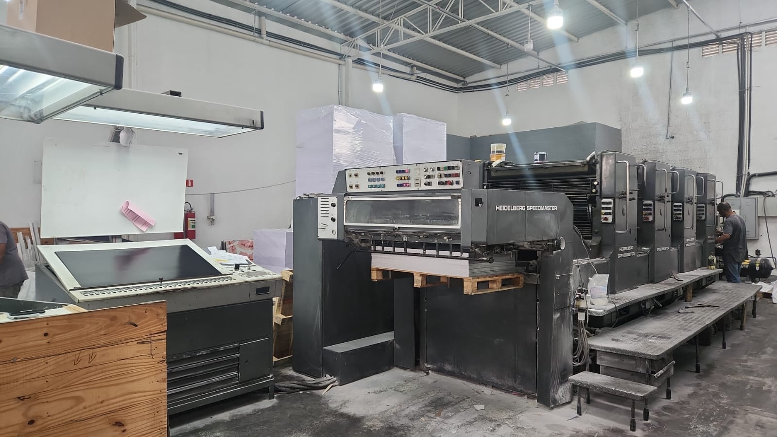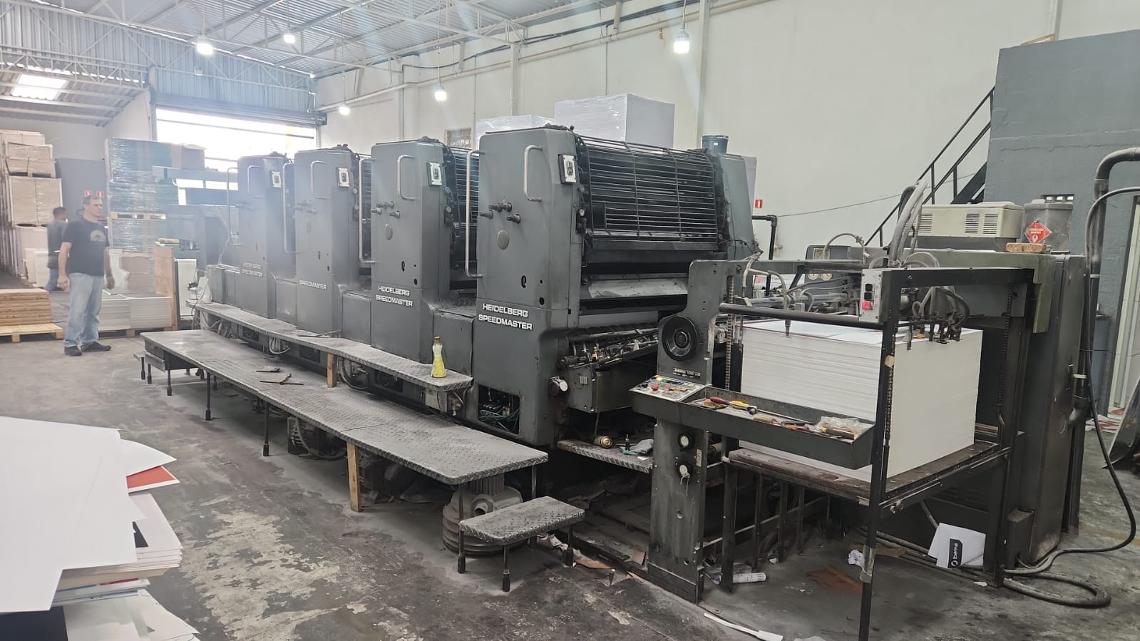 Impressora offset usada, marca Heidelberg, modelo SM 102 V, ano 1986, 4 cores, formato 72 x 102 cm, equipada com molha CPTronic, Alcolor original, em produção.