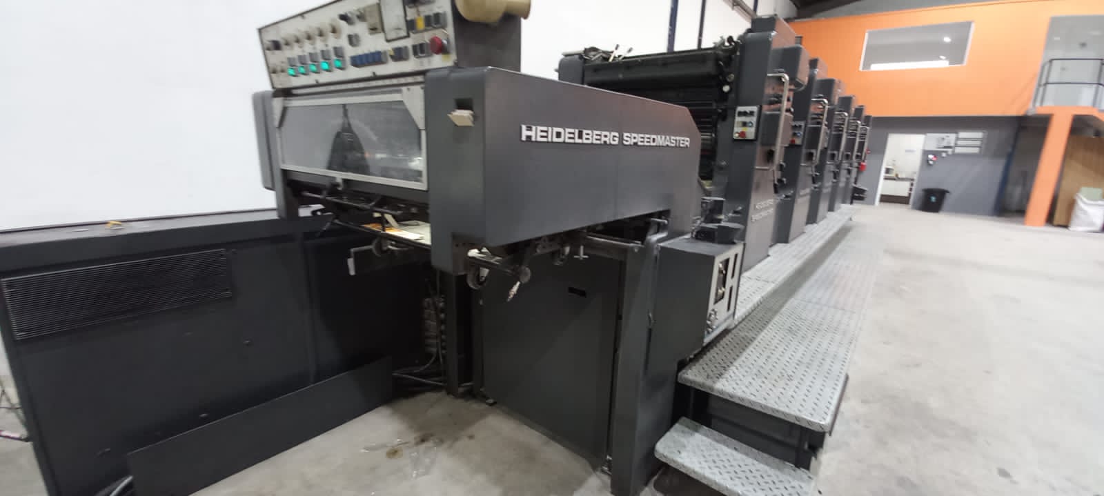 Impressora offset usada Heidelberg, modelo SM 72 FP, ano 1990, 5 cores, formato 52 x 72 cm, equipada com CPC 1.02, molha Alcolor, reversão 1/4, com rolaria nova.