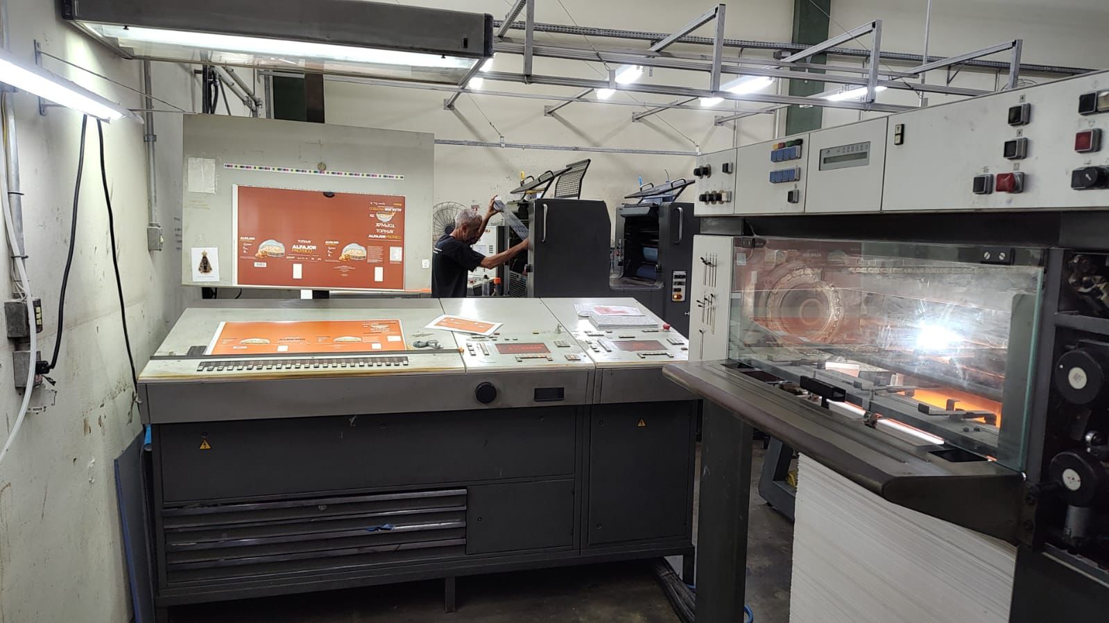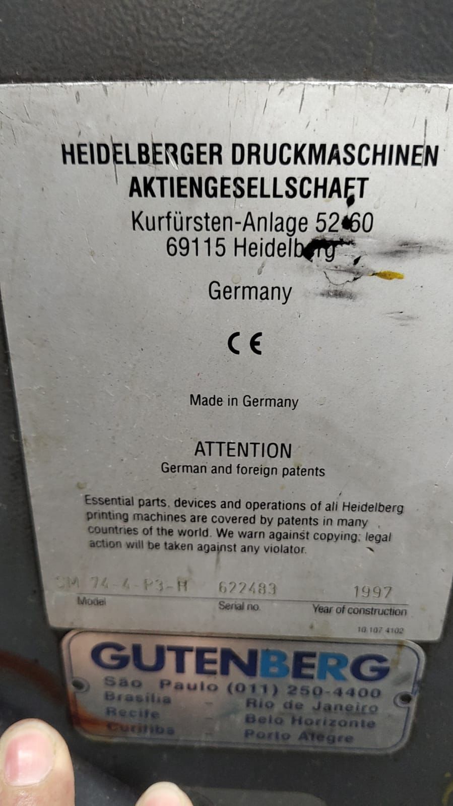 Impressora offset usada, marca Heidelberg, modelo SM 74-4 PH, ano 1997, 4 cores, formato 52 x 74 cm, equipada com CPC/CPTronic, Autoplate, molha Alcolor, reversão 2/2, pilha alta na saída.