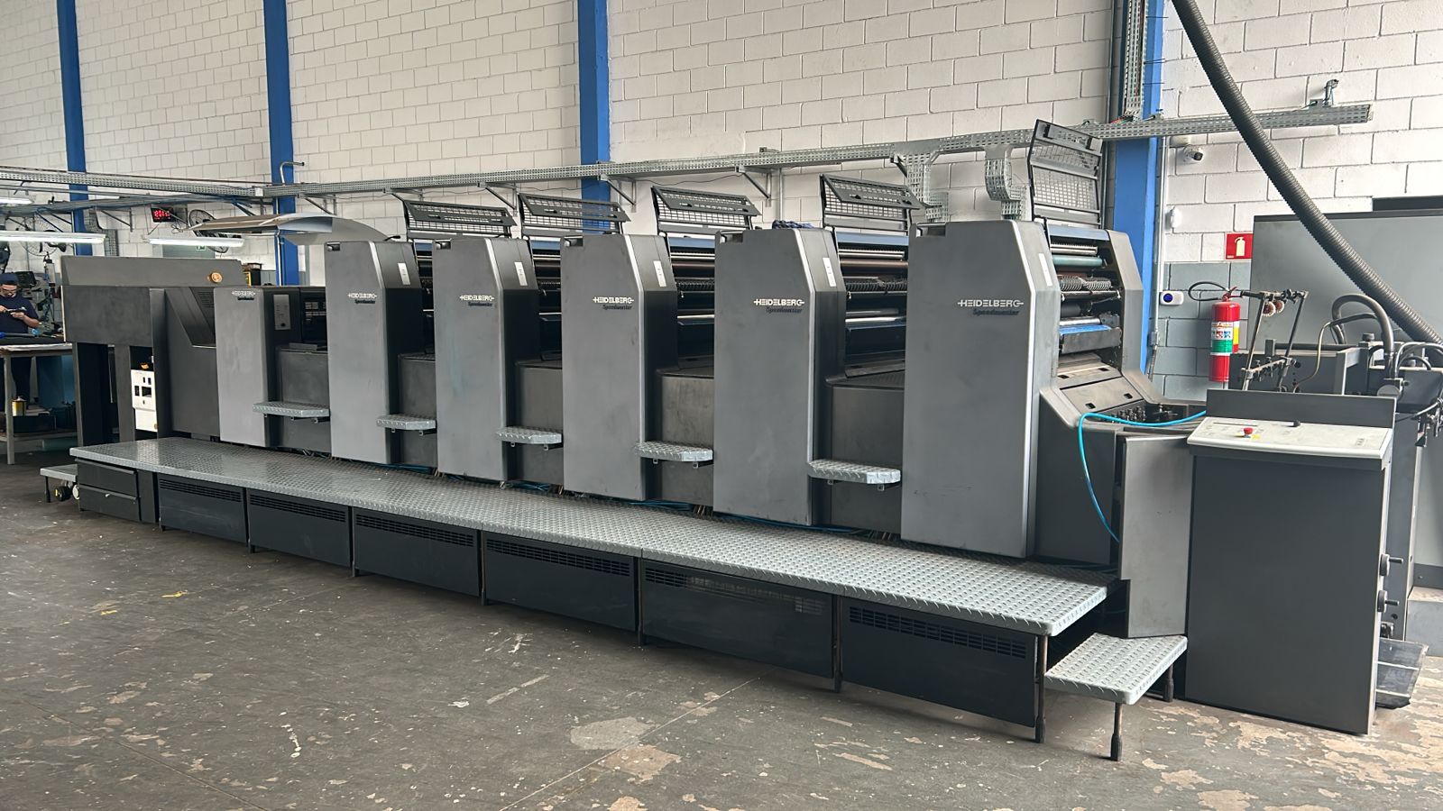 Impressora offset usada, marca Heidelberg, modelo SM 74-5+L, ano 2000, 5 cores + verniz, formato 52 x 74 cm, equipada com CP 2000, Autoplate, molha Alcolor com refrigeração Technotrans, secador IR, lavadores automáticos, rolaria nova Bottcher.
