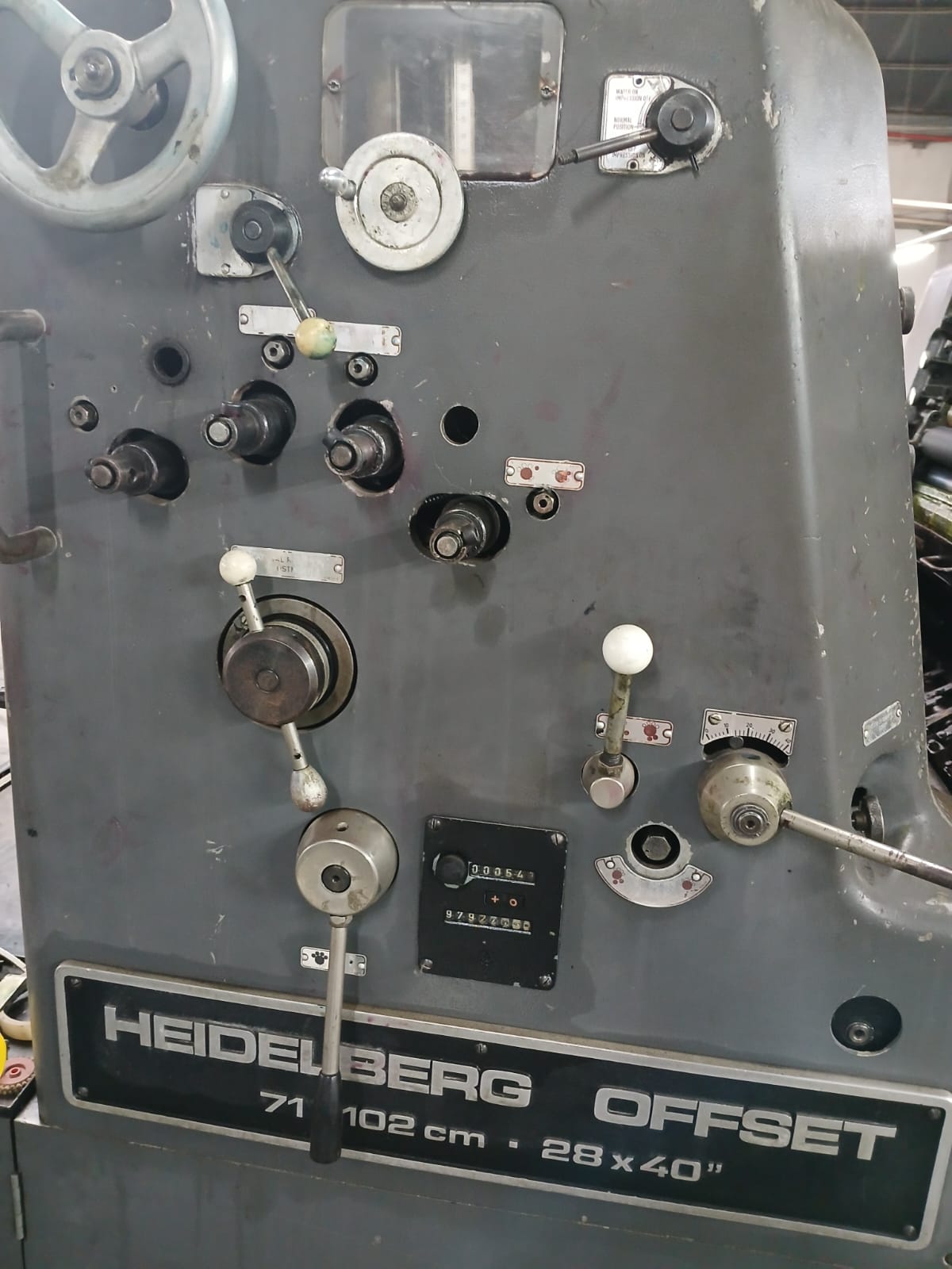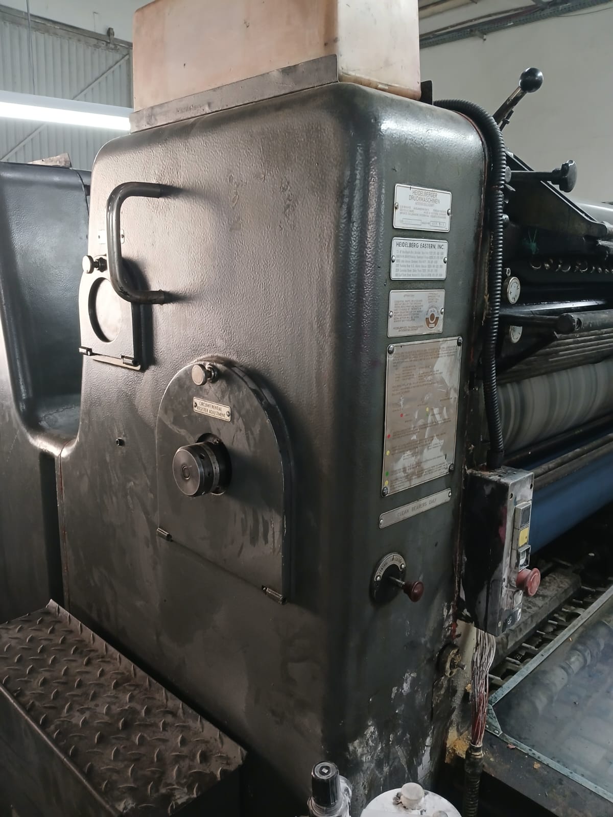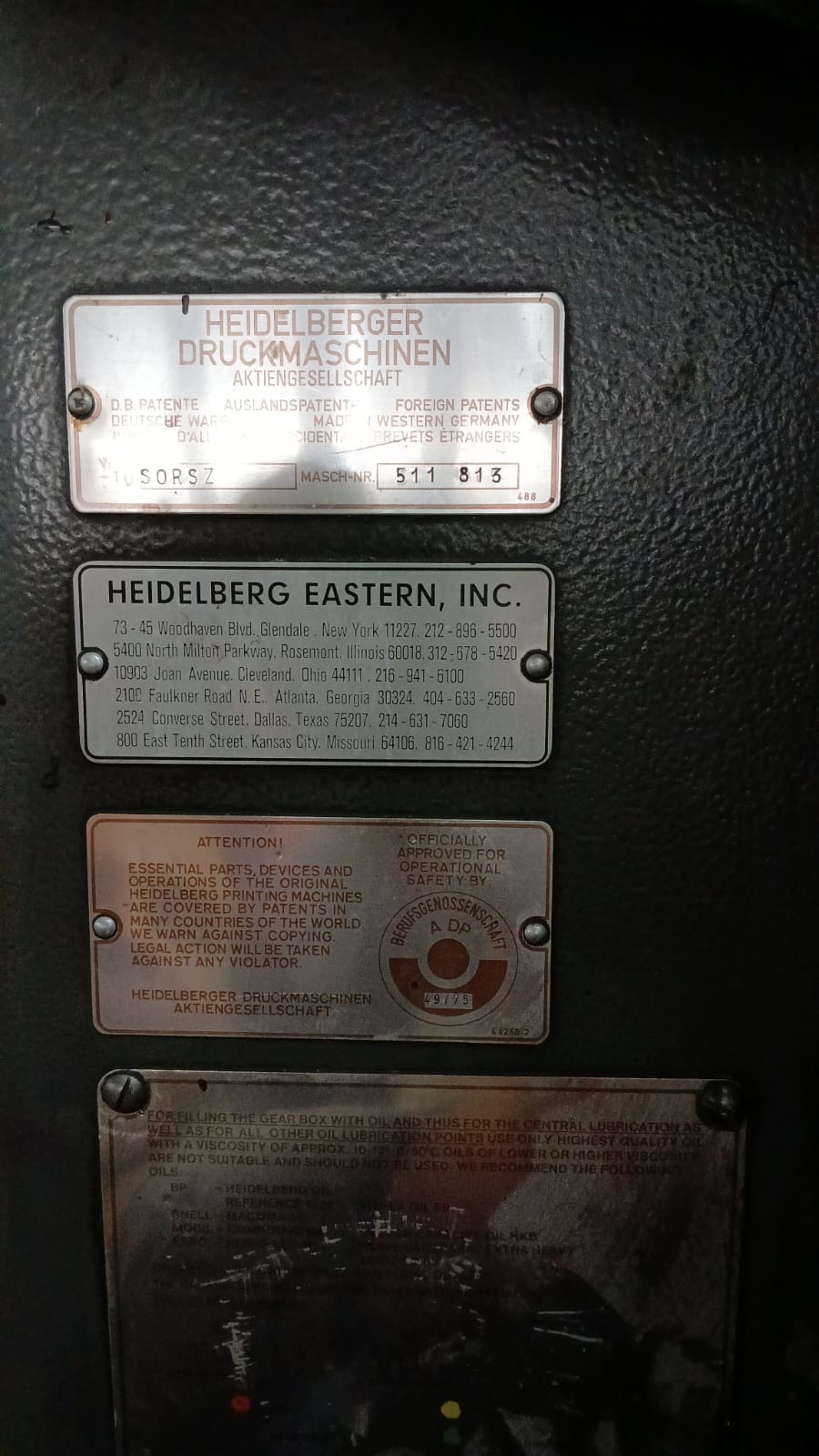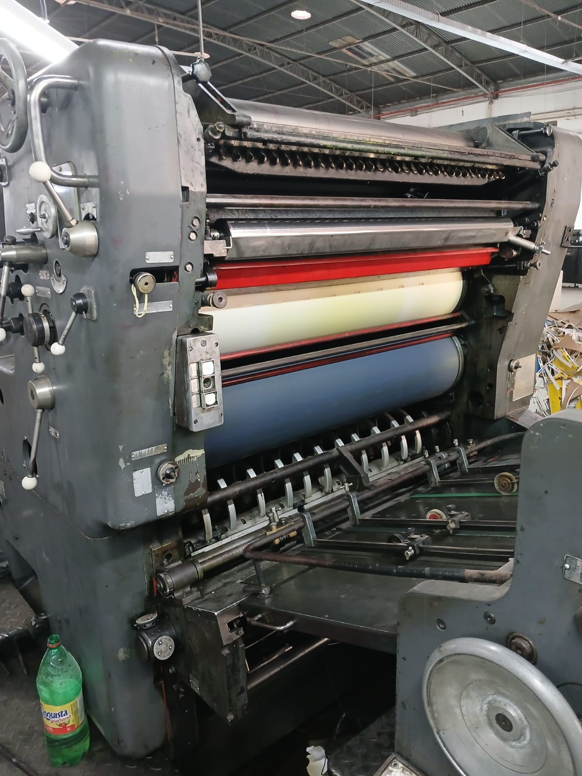 Impressora offset usada, marca Heidelberg, modelo SORSZ, ano 1978, bicolor, formato 72 x 102 cm, equipada com molha convencional, em produção rodando cromia,