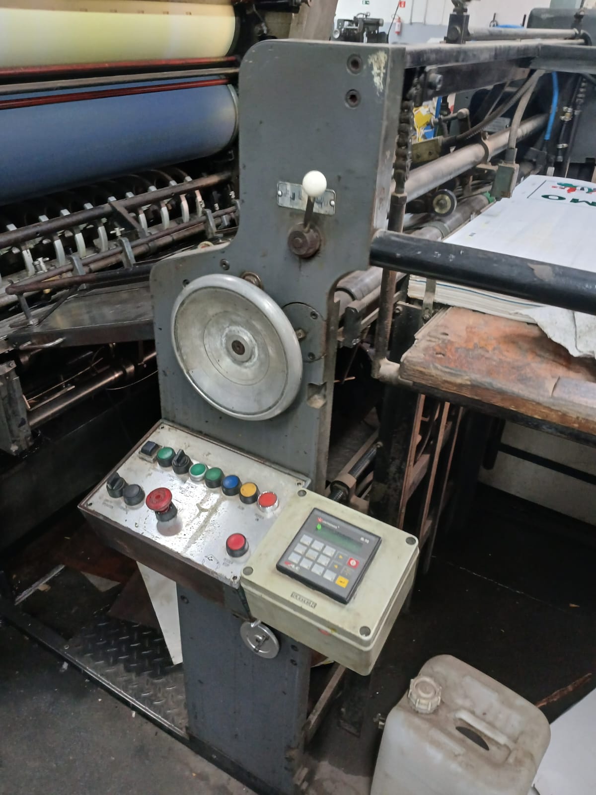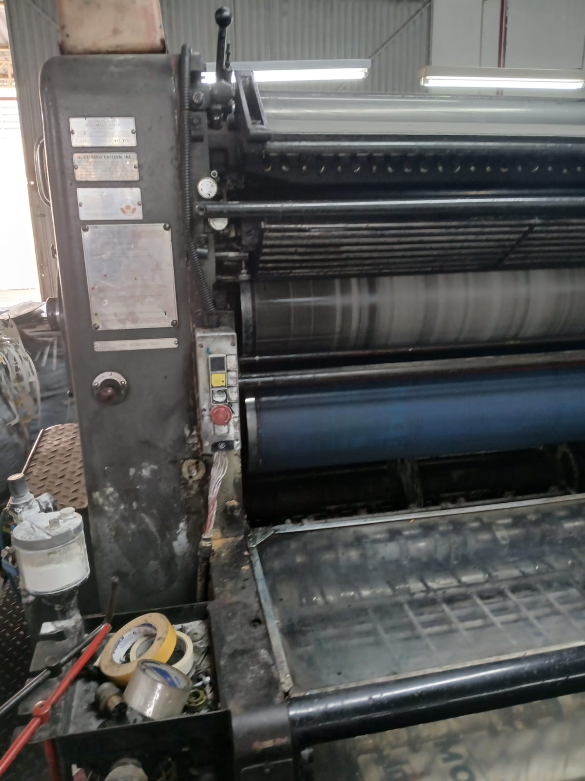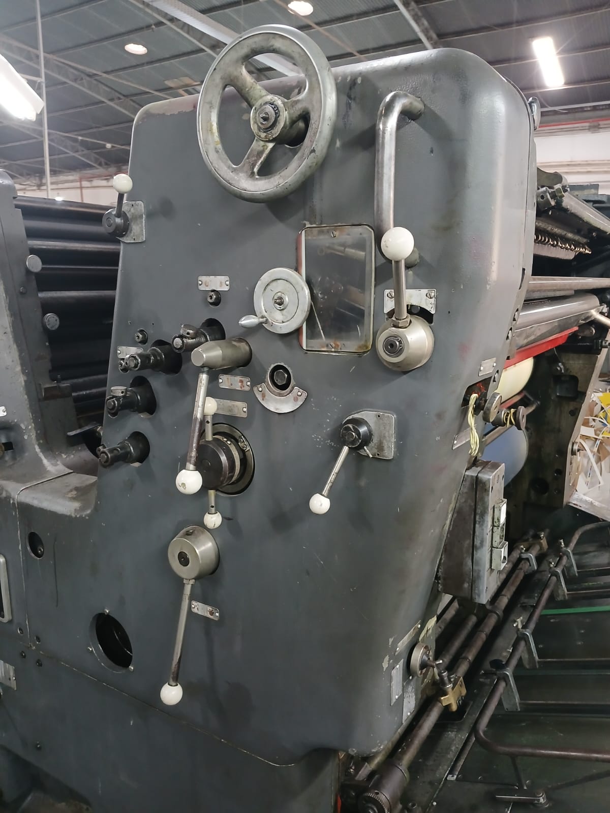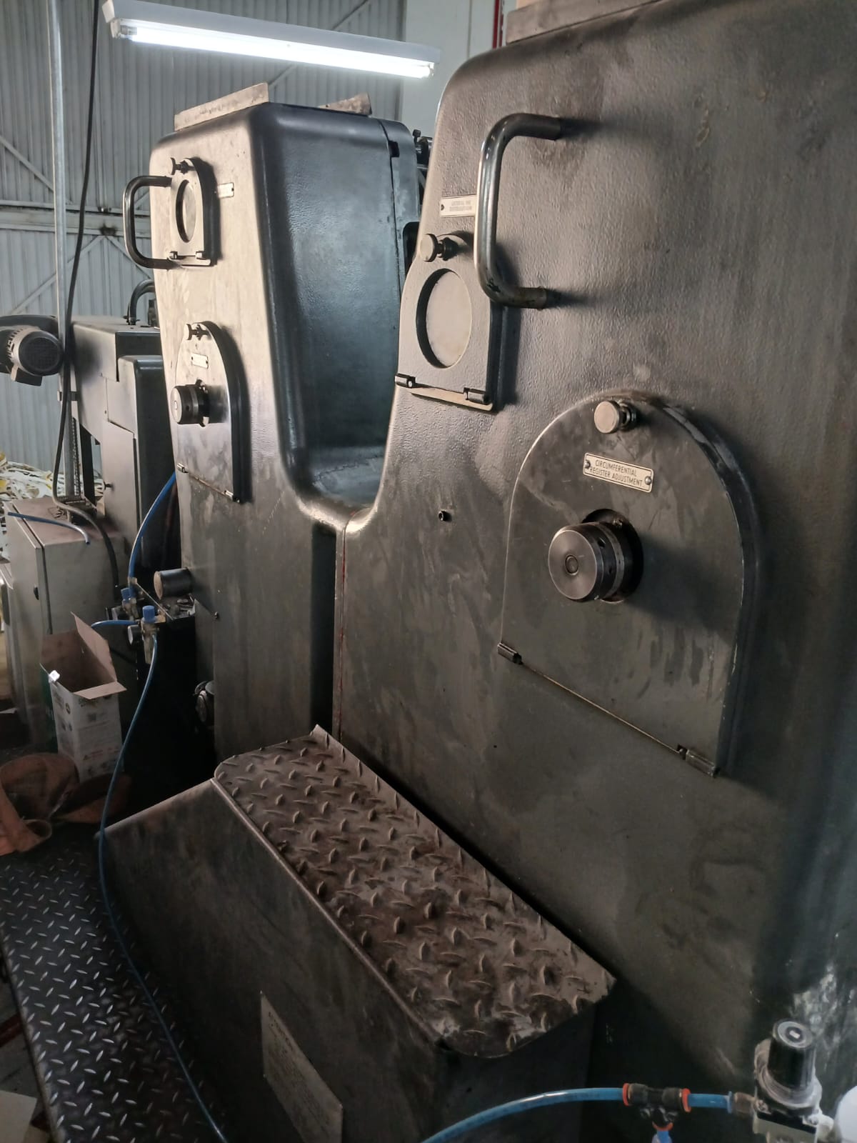 Impressora offset usada, marca Heidelberg, modelo SORSZ, ano 1978, bicolor, formato 72 x 102 cm, equipada com molha convencional, em produção rodando cromia,