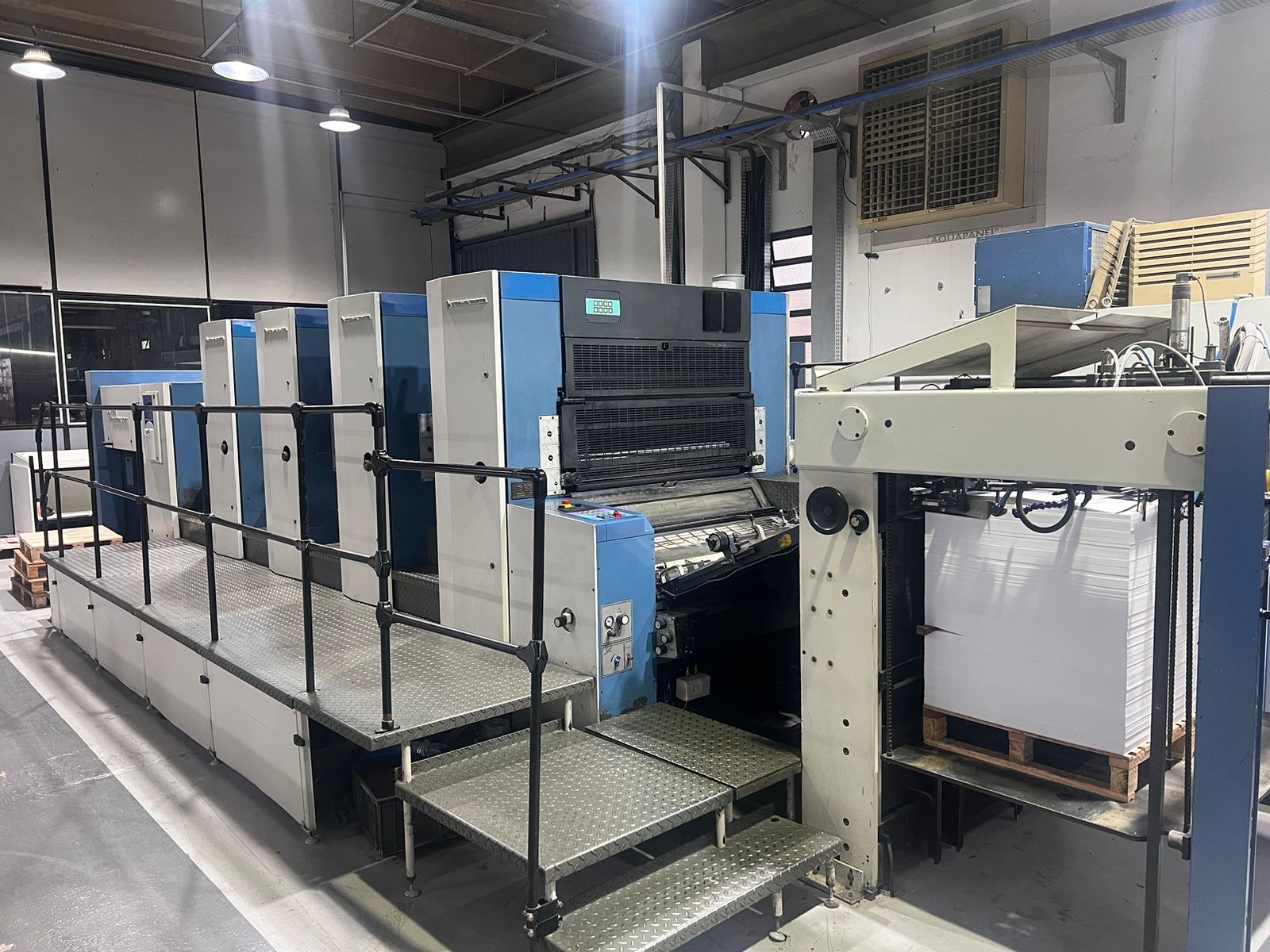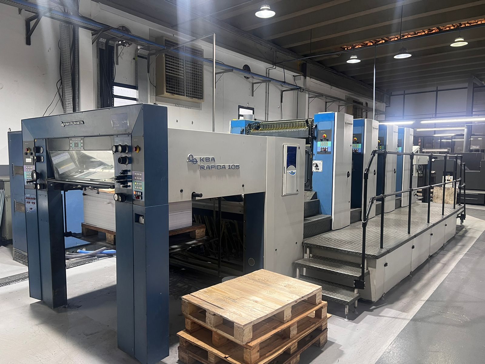 Impressora offset usada, marca KBA, modelo Rapida 105-4, ano 2000, 4 cores, formato 72 x 105 cm, equipada com Colortronic console, SAPC-troca de chapas, lavadores automáticos, cilindros de dupla circunferência, velocidade 16.000 IPH, CIP3, em produção.