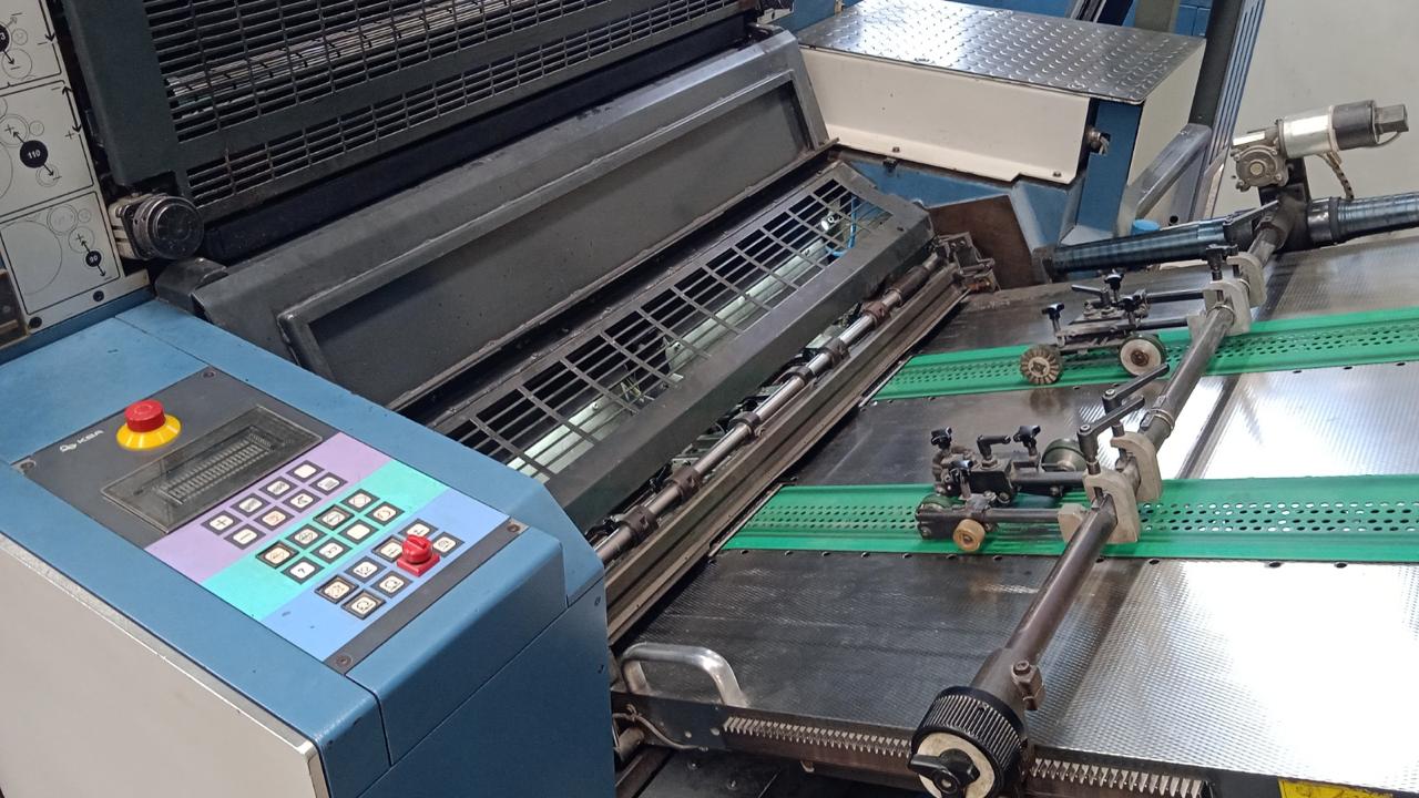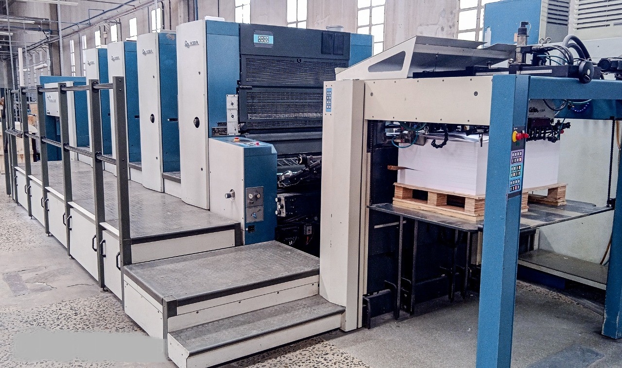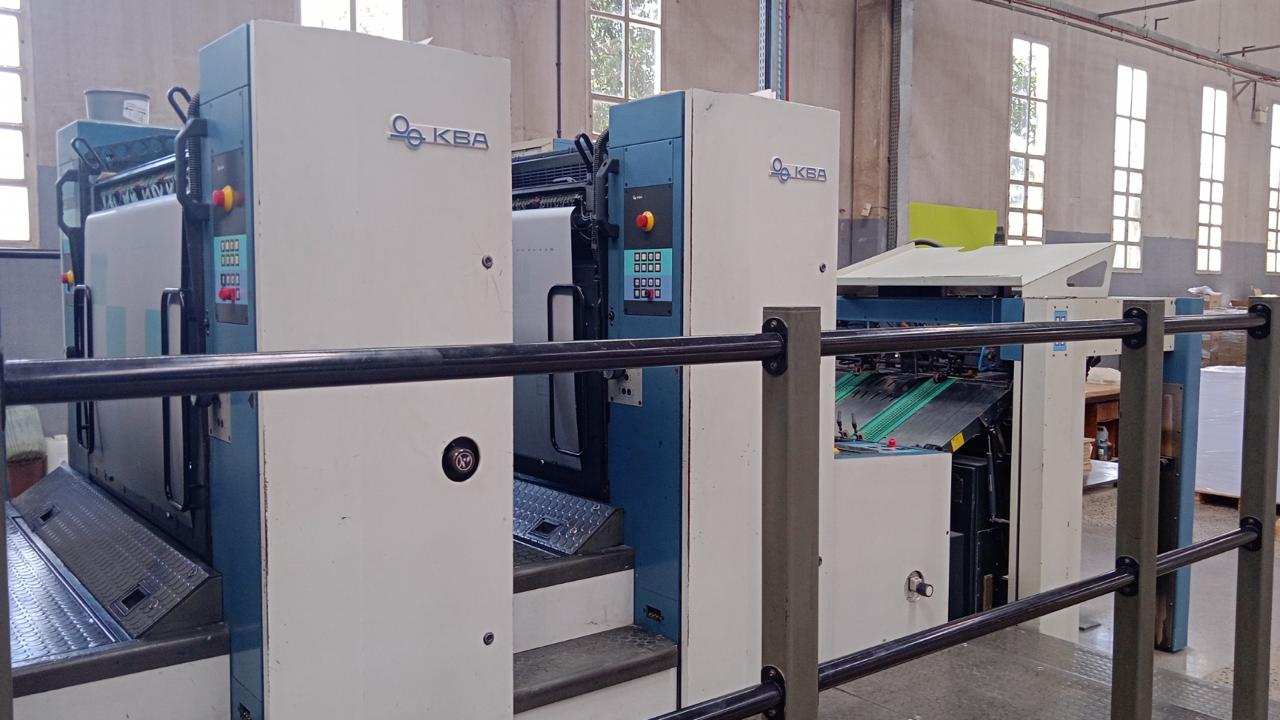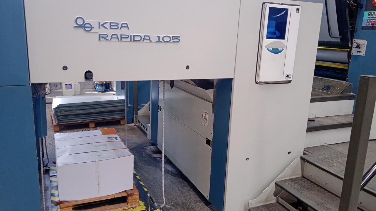 Impressora offset usada, marca KBA, molelo Rapida 105-4, ano 2002 4 cores, formato 72 x 105 cm, equipada com Colortronic, Varidamp, FAPC-troca de chapas, todos os lavadores automáticos, pulverizador Weko AP, molha com refrigeração Baldwin, em produção.