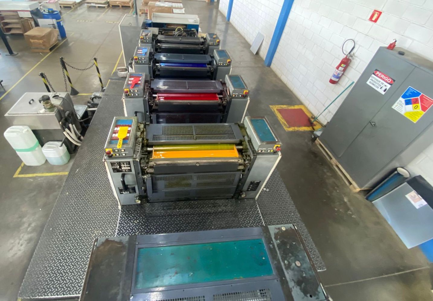 Impressora offset usada, marca Komori, modelo Lithrone 428, ano 2001, 4 cores, formato 52 x 74 cm, PQC -Print Quality Control, SAPC – troca de chapas semi-automática,  molha Komorimatic, pilha alta na saída, em produção.