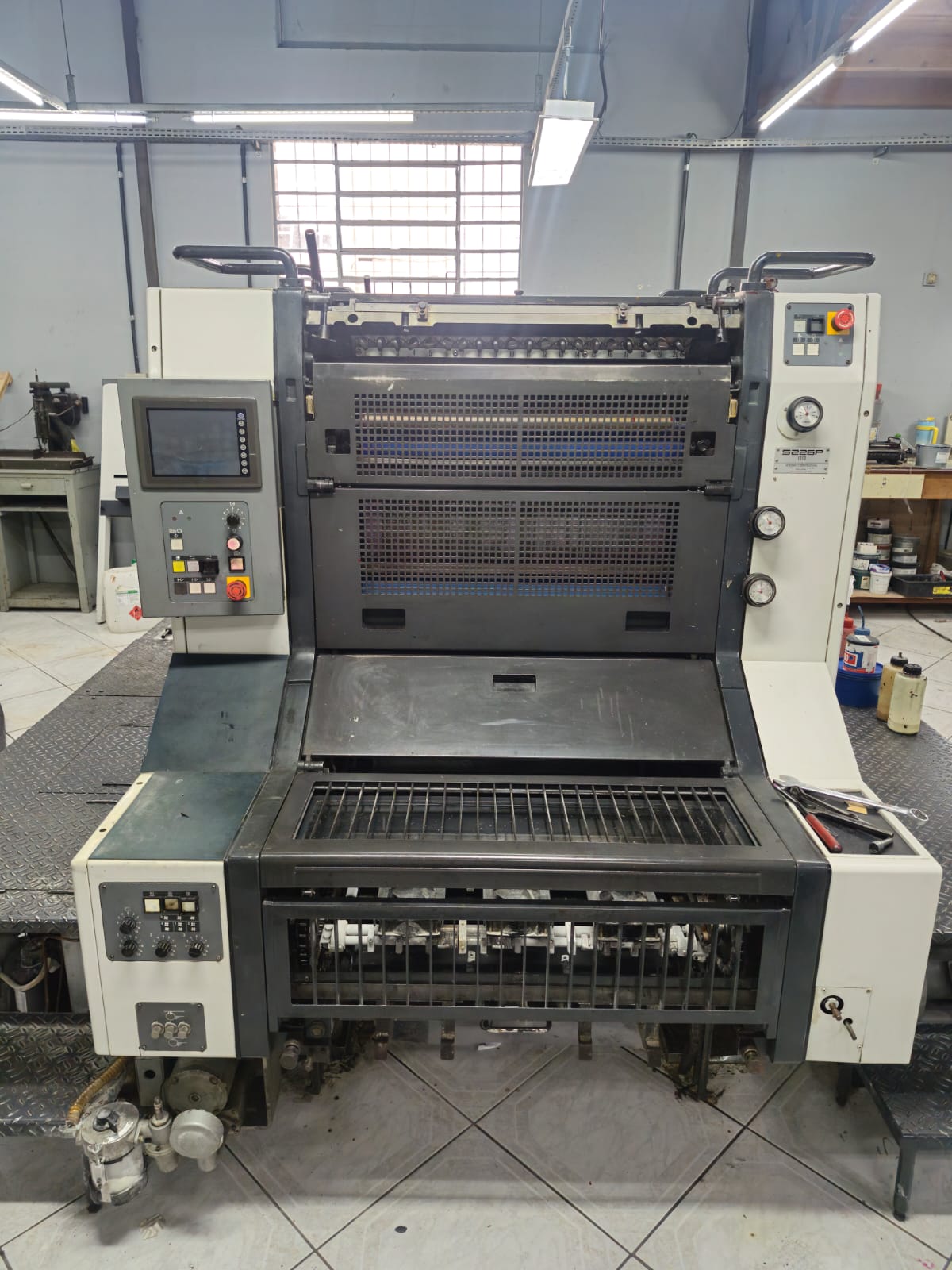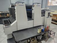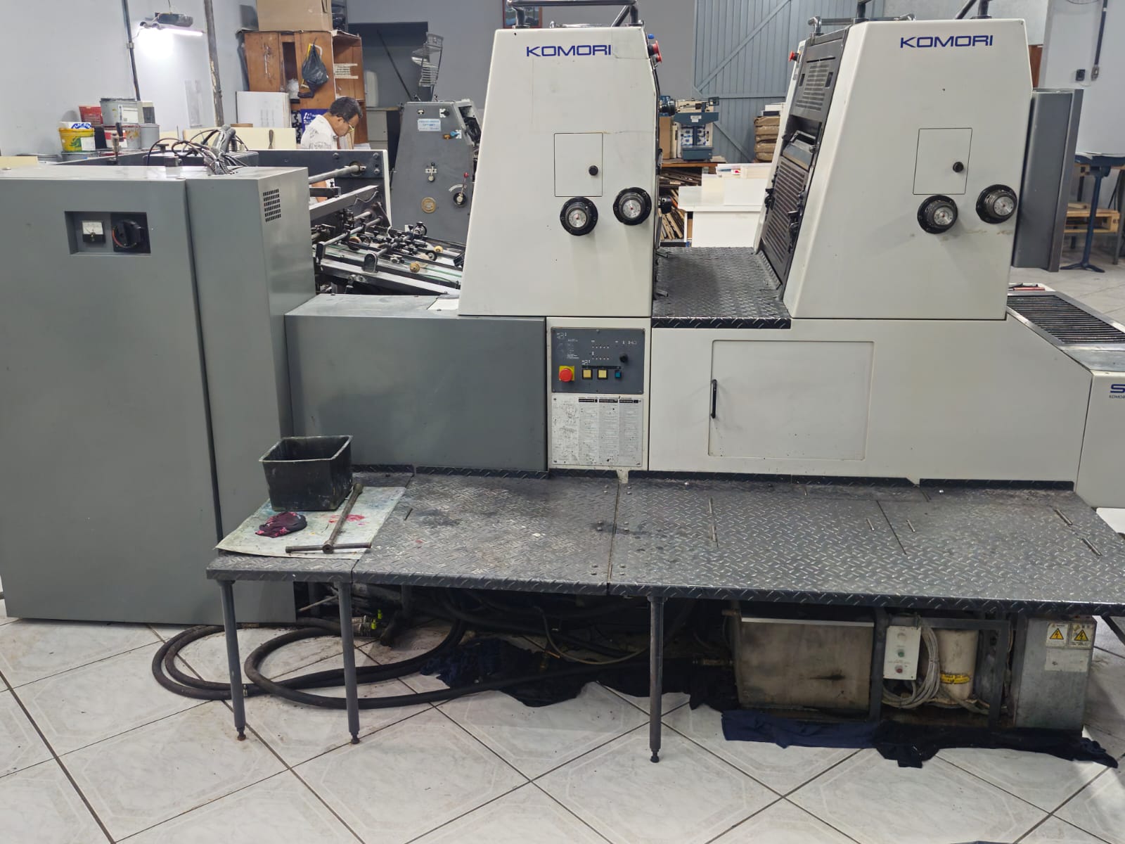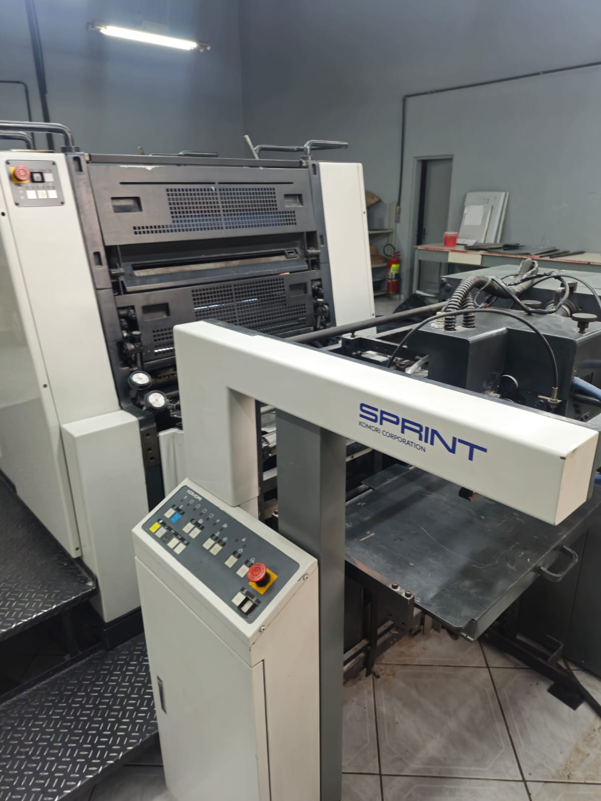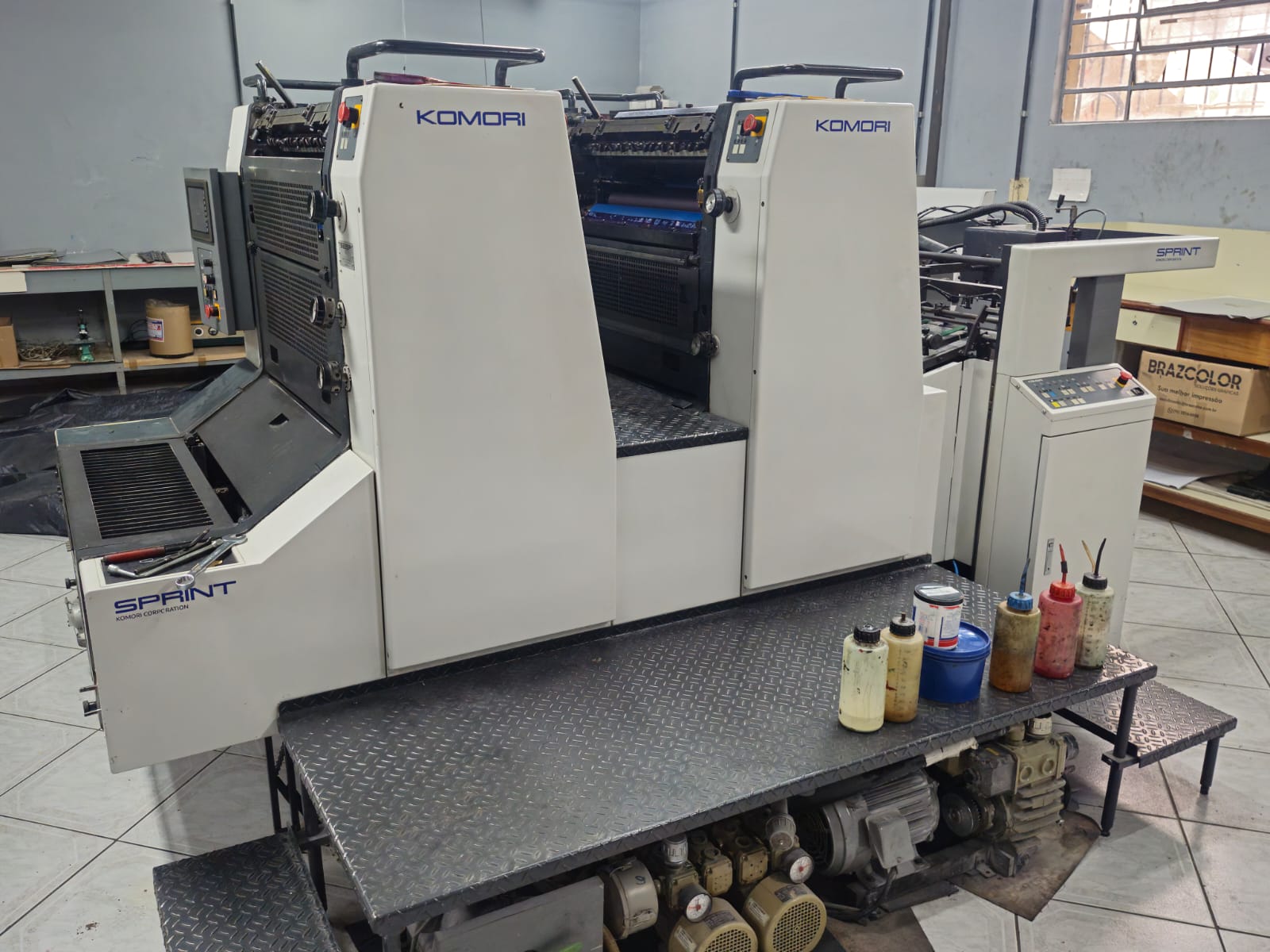 Impressora offset usada, marca Komori, modelo Sprint 26, ano 2000, bicolor, formato 48 x 66 cm, equipada com molha Komorimatic, APC-troca de chapas, rolaria nova, com furador de chapas.