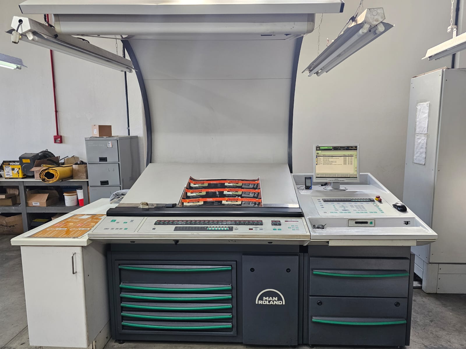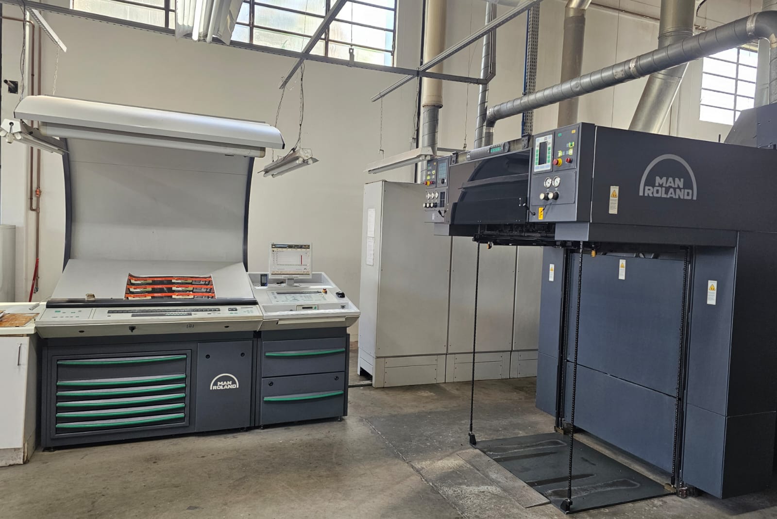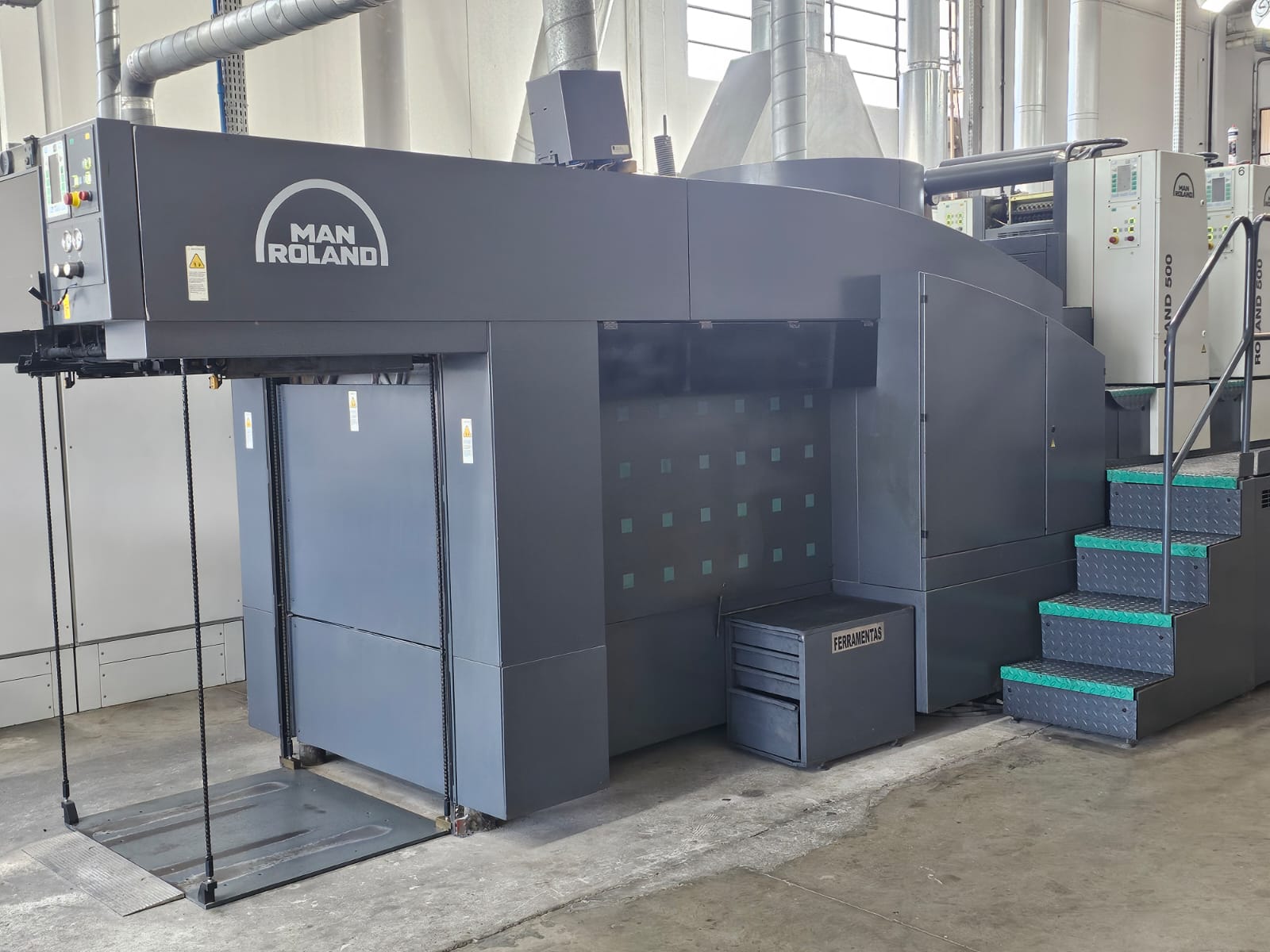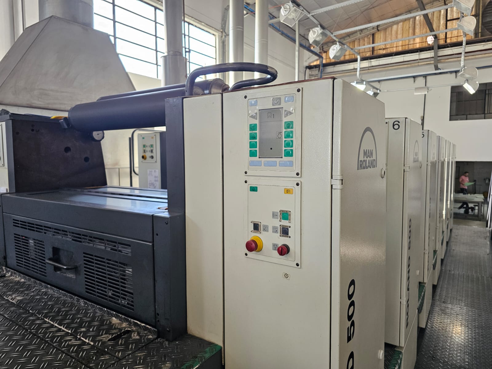 Impressora offset usada, marca Man Roland, modelo 506 LV +UV Hybrid, ano 2004, 6 cores + verniz, formato 59 x 74 cm, equipada com RCI2, Color Pilot, troca de chapas PPL, unidade de verniz com 3 rolos Anilox, sistema de secagem UV Grafix com 2 decks na saída + 3 interdecks, secagem I/R Grafix G52C, saída extendida com AirGlide, molha Deltamatic Roland, controle de temperatura de rolos Tecnotrans, elevação de 480 mm Plinth, todos os lavadores automáticos, imprime material de 0,04 a 1 mm de espessura, com 112 milhões de impressos.