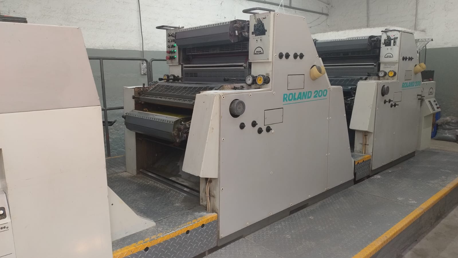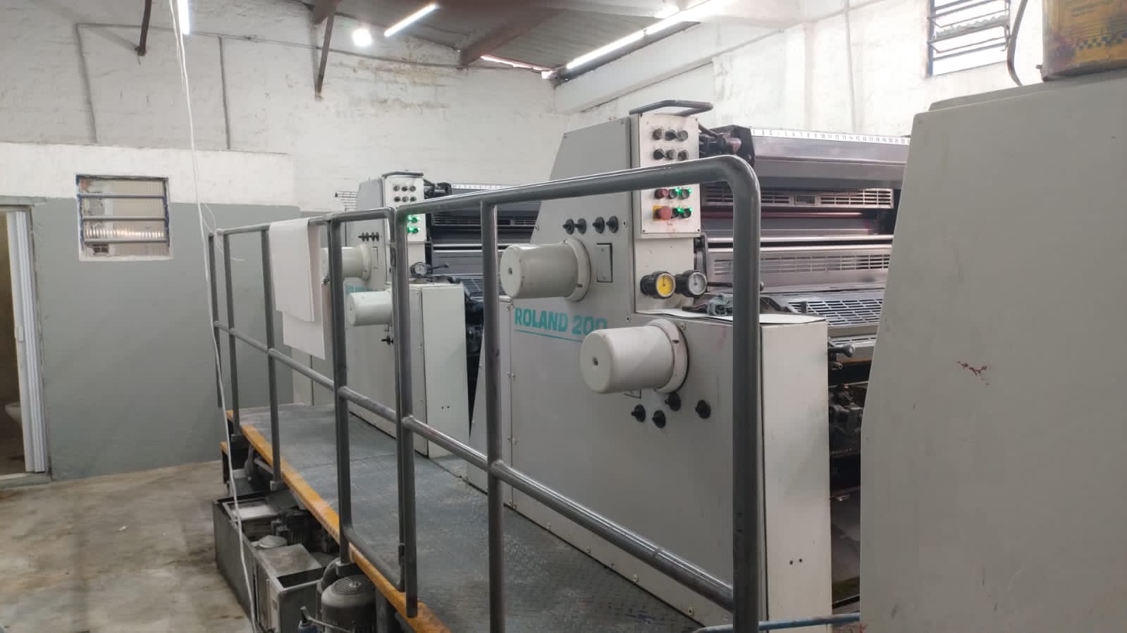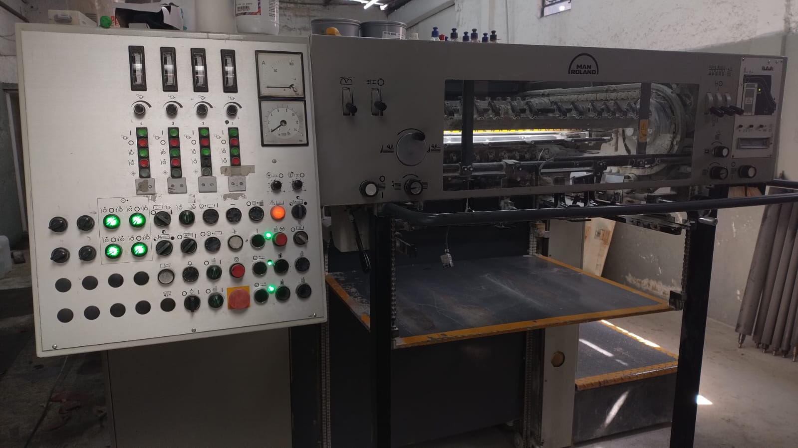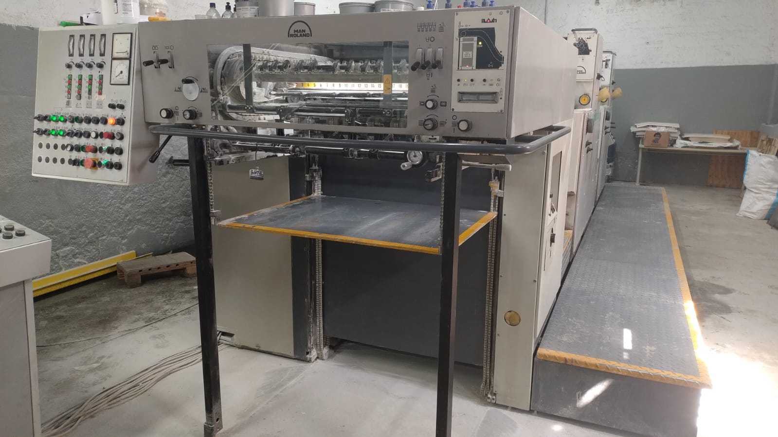 Impressora offset usada, marca Man Roland, modelo 204 HOB, ano 1996, 4 cores, formato 52 x 74 cm, equipada com RCI (console), molha Rolandmatic, pilha alta na saída, em produção.
