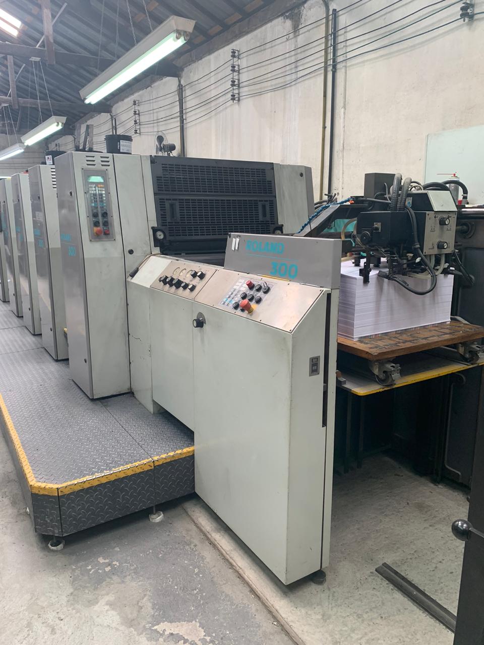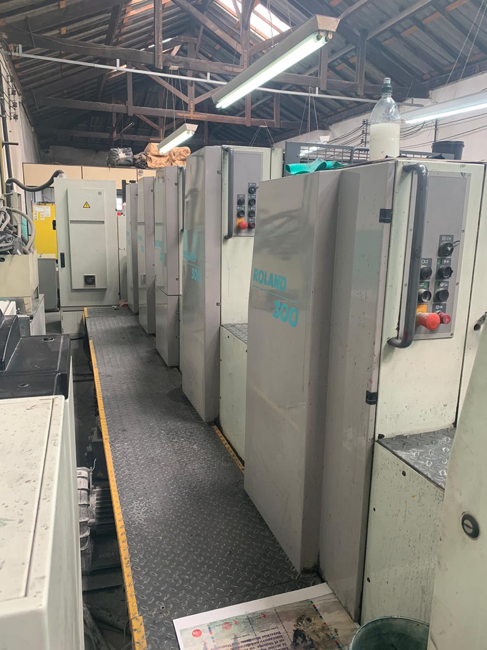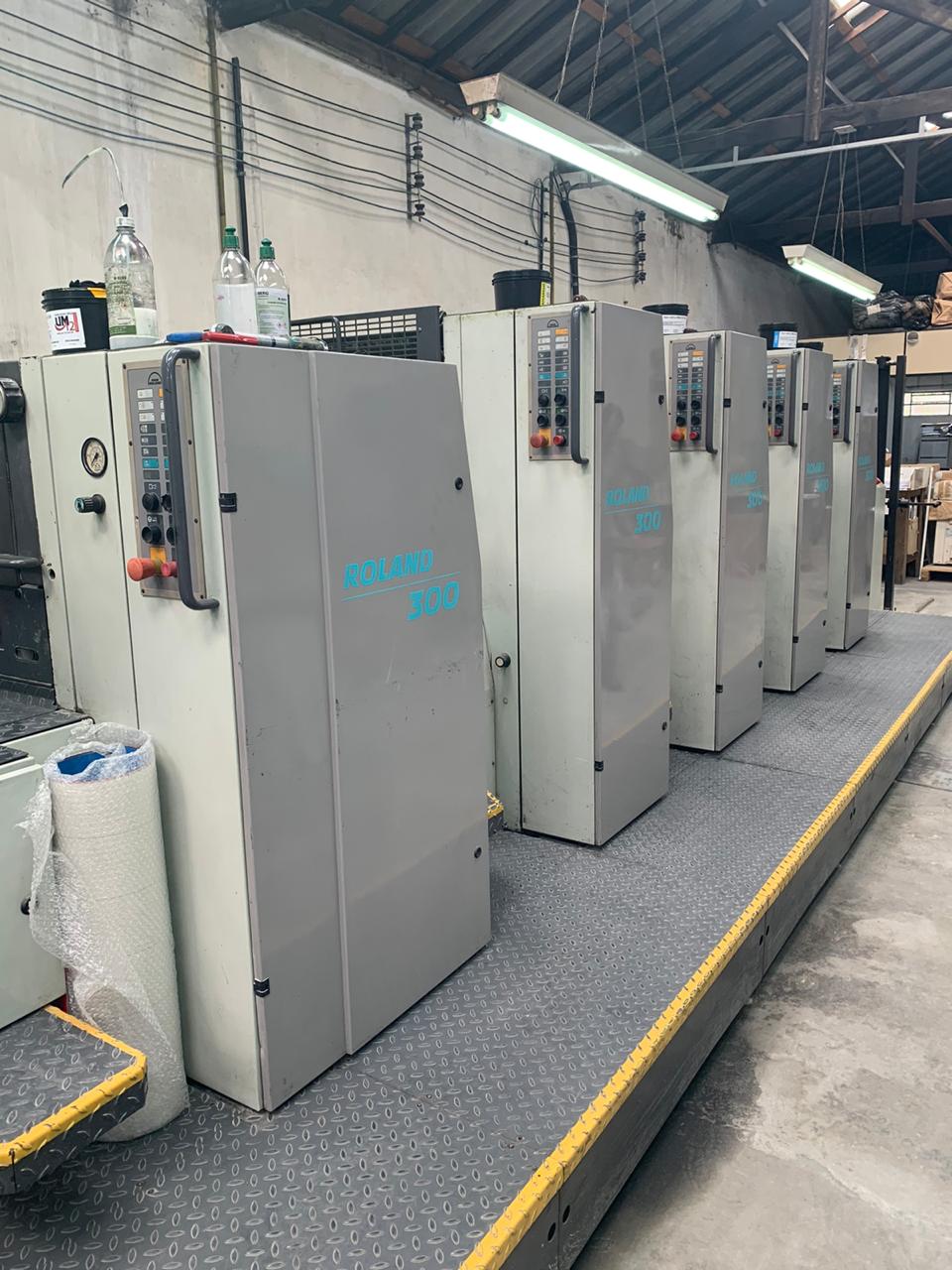 Impressora offset usada, marca Roland, modelo 304+L, ano 2000, formato 52 x 74 cm, 4 cores + unidade de verniz, RCI, APL-troca de chapas, lavadores automáticos, secador IR, em produção.