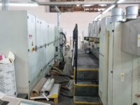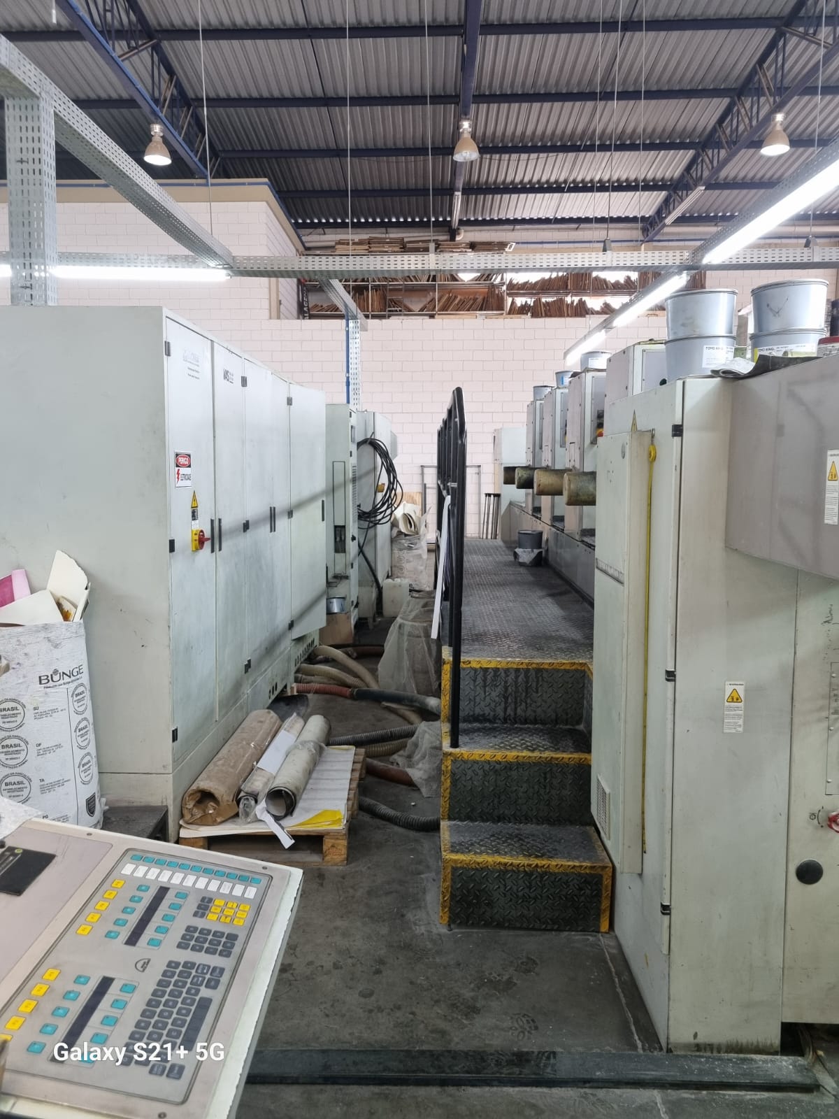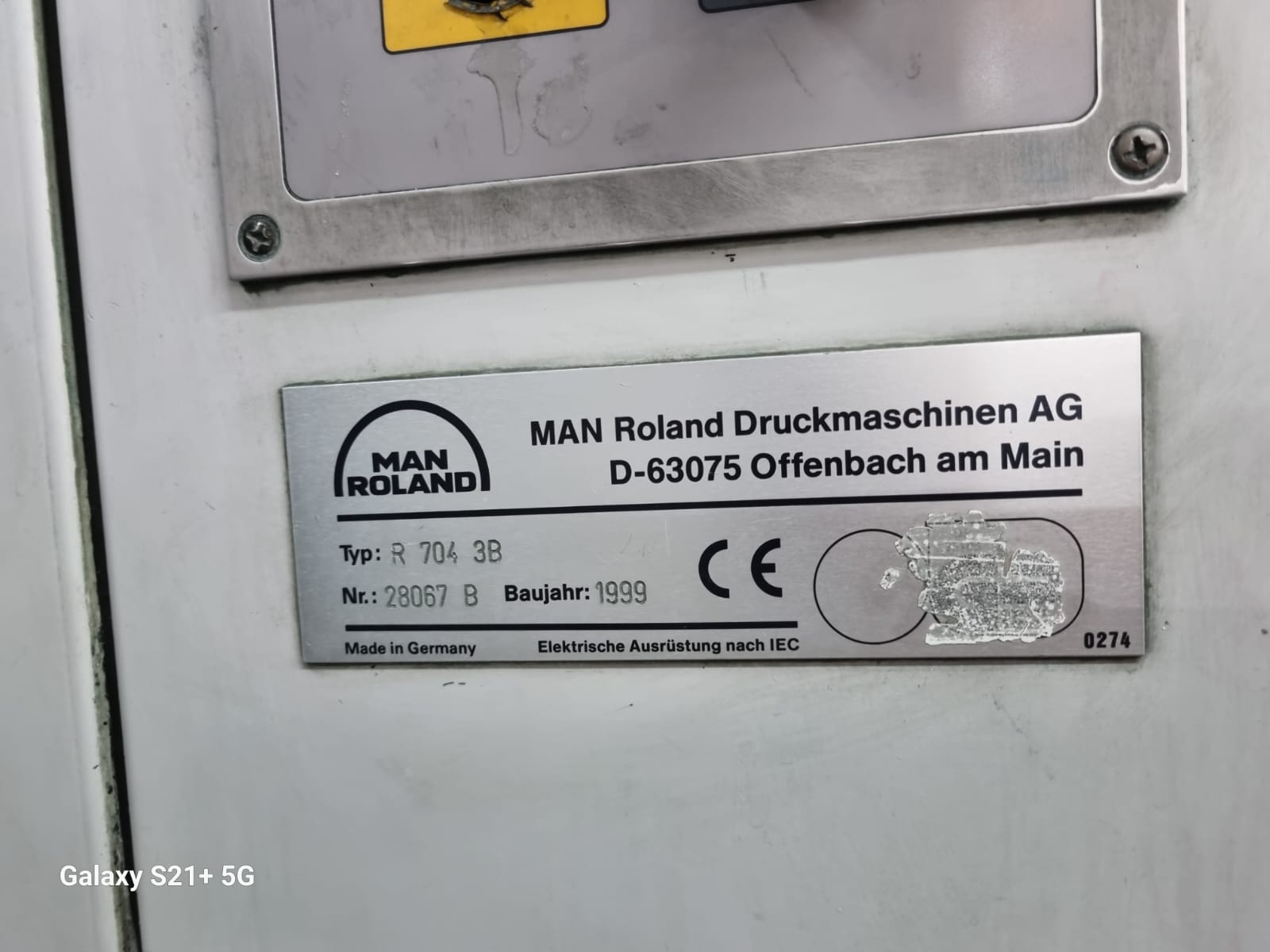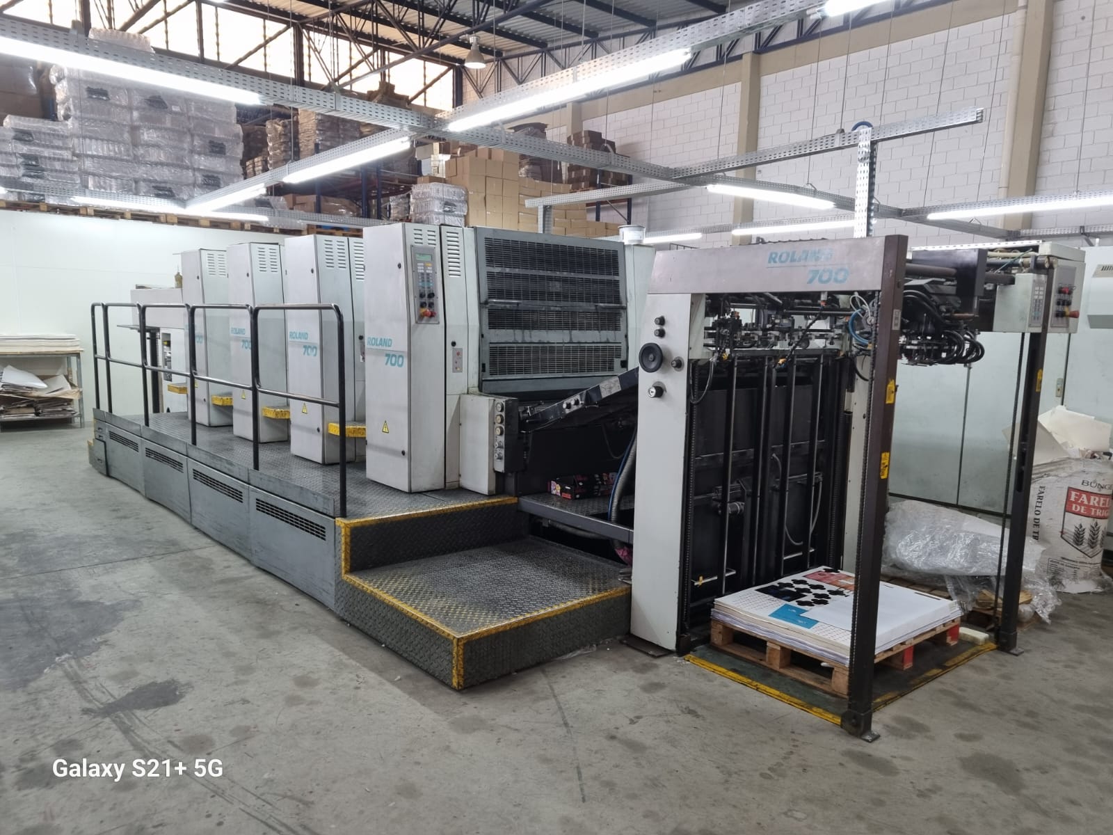 Impressora offset usada, marca Roland, modelo 704 3B P, ano 1999, 4 cores, formato 74 x 102 cm, equipada com RCI, molha Rolandmatic, refrigeração Technotrans, APL – troca de chapas semi-automática, lavadores automáticos, em produção.