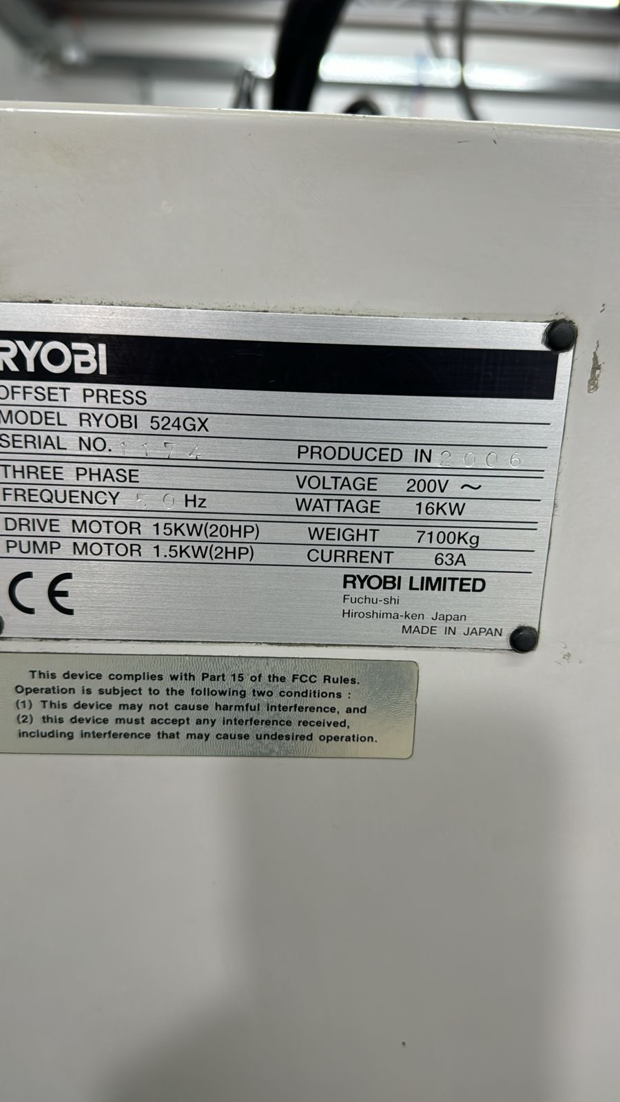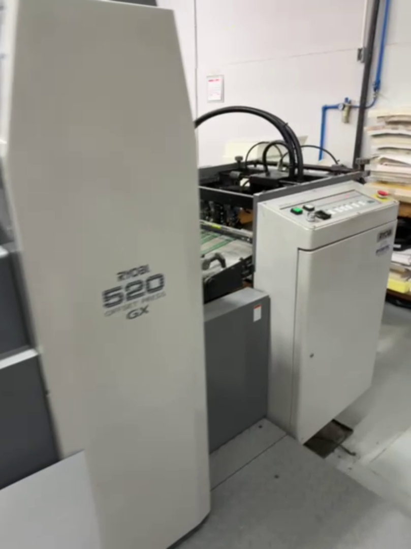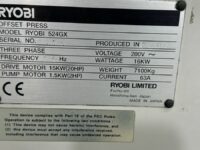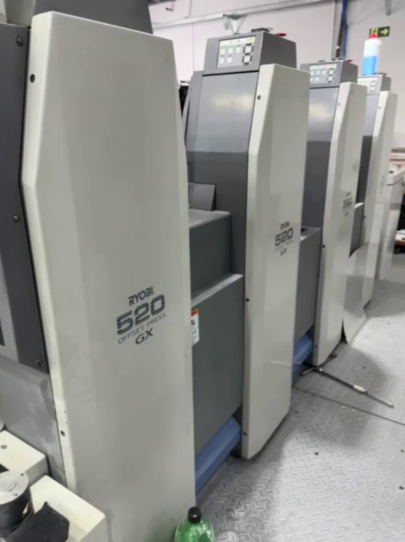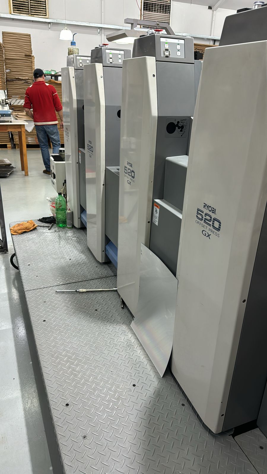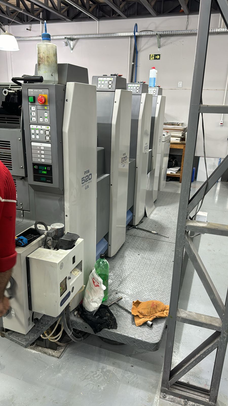 Impressora offset usada, marca Ryobi, modelo 524 GX, ano 2006, 4 cores, formato 37 x 52 cm, equipada com PCS console, SAPC – troca de chapas semi-automática, lavadores automáticos, em produção.