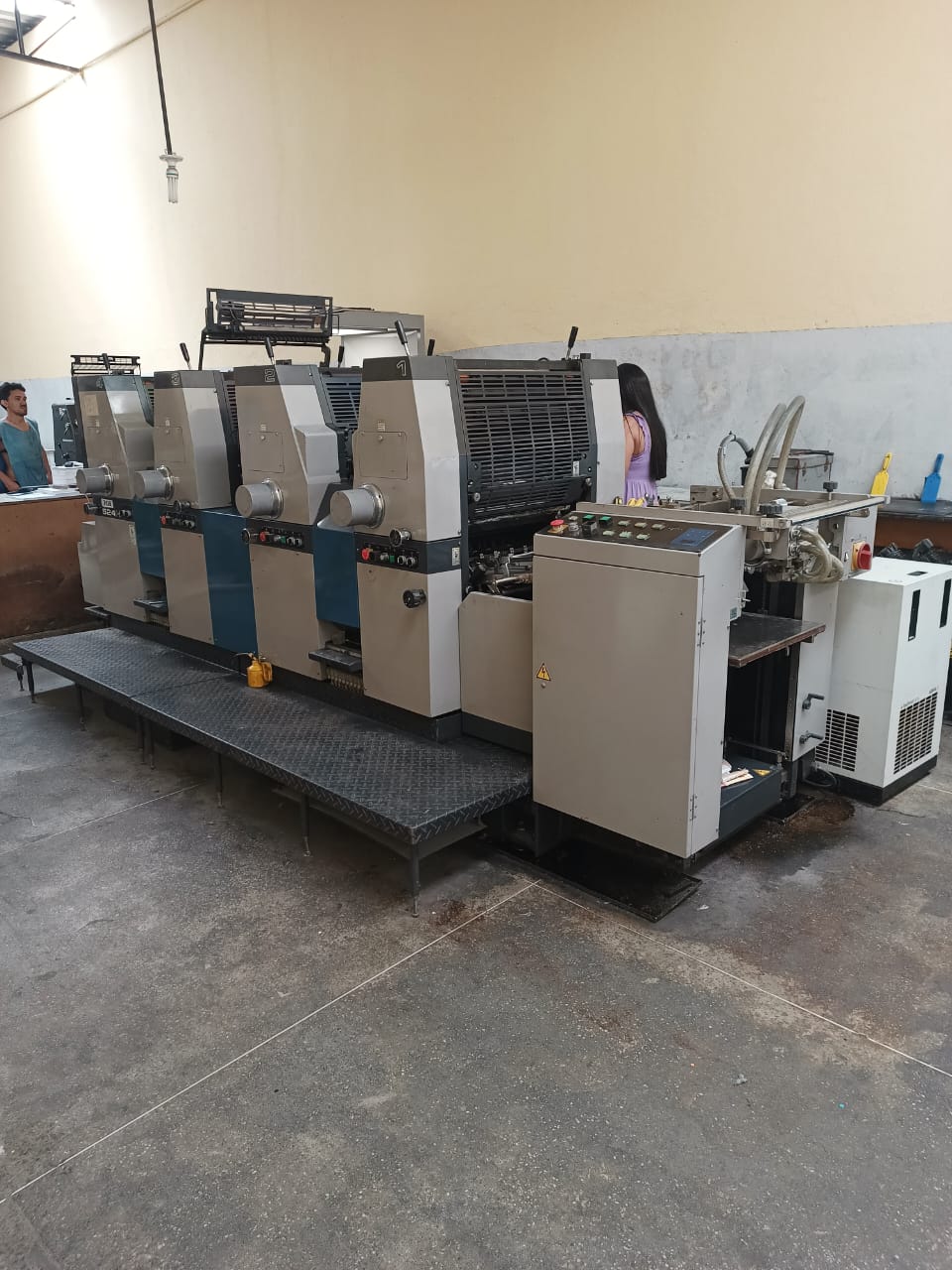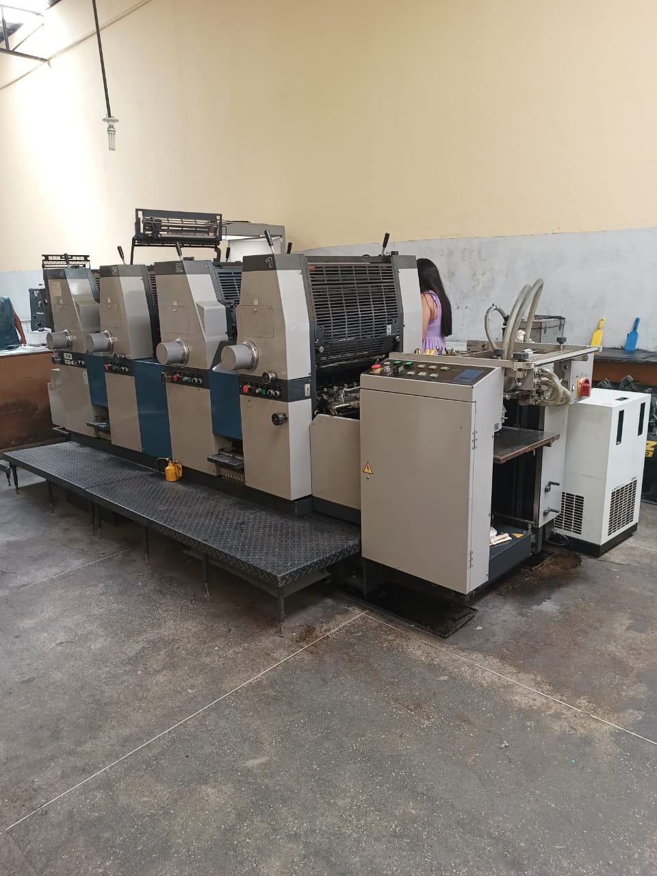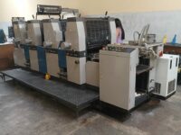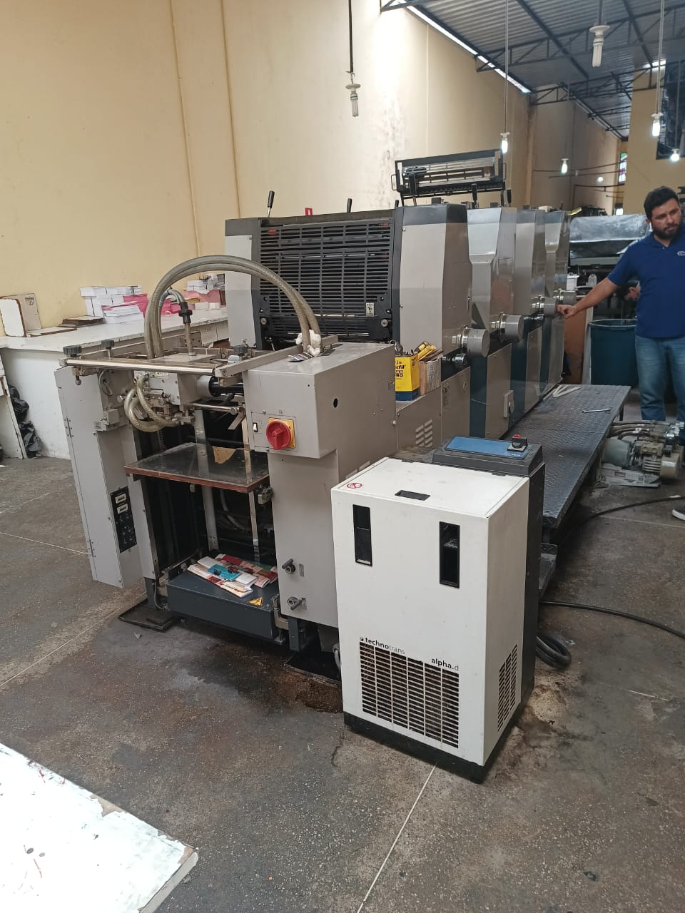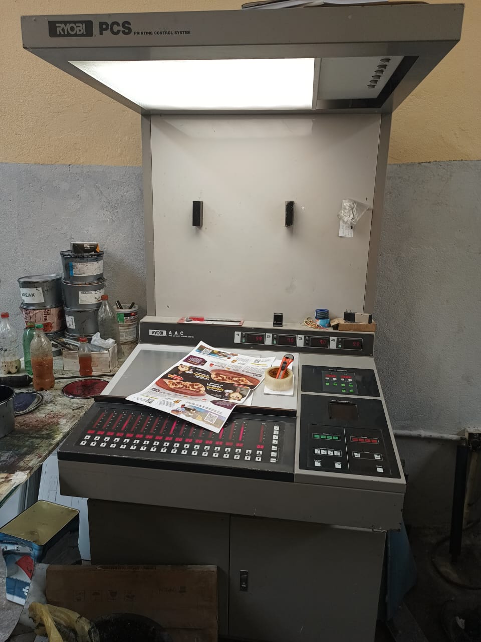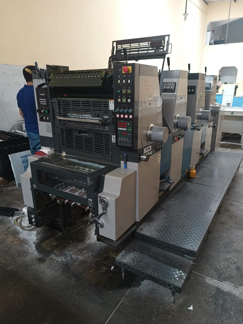 Impressora offset usada, marca Ryobi, modelo 524 H, ano 1998, 4 cores, formato 37 x 52 cm, equipada com PCS – Print Constrol System, molha Ryobimatic, em produção.