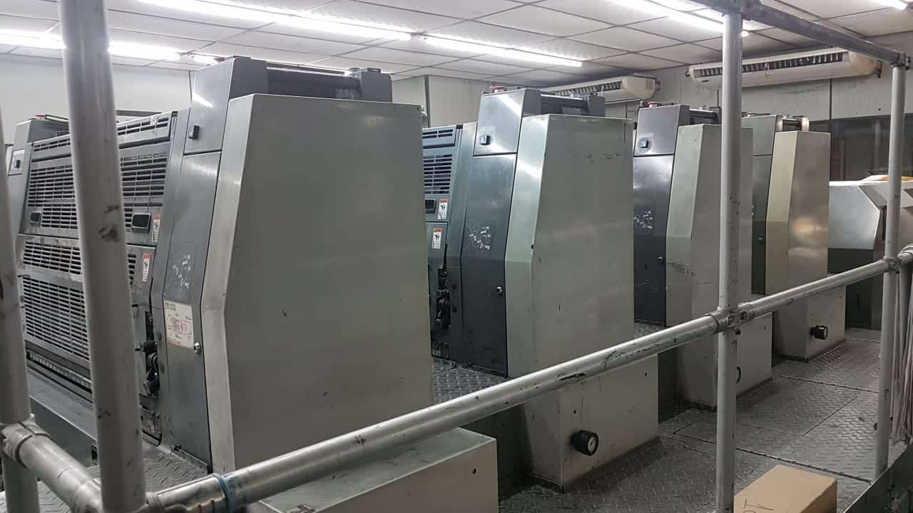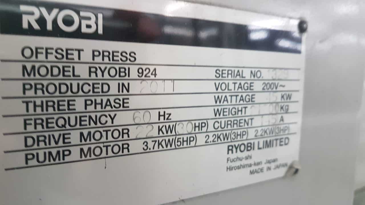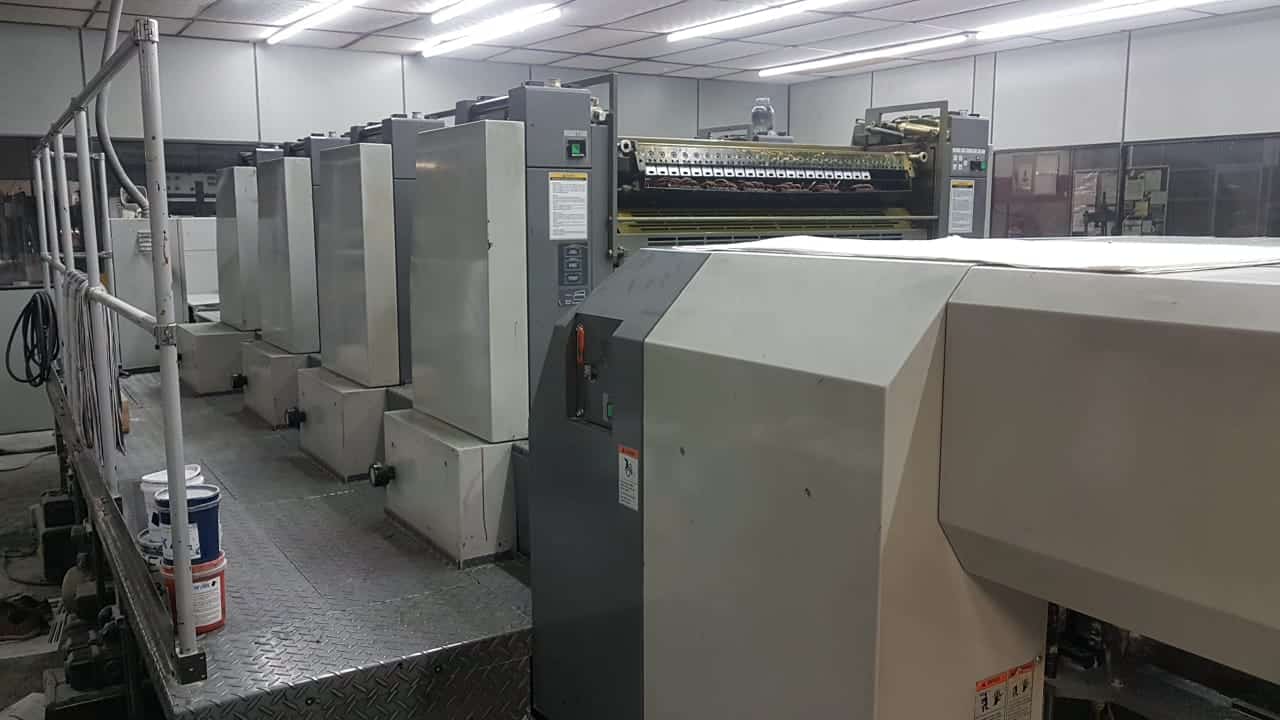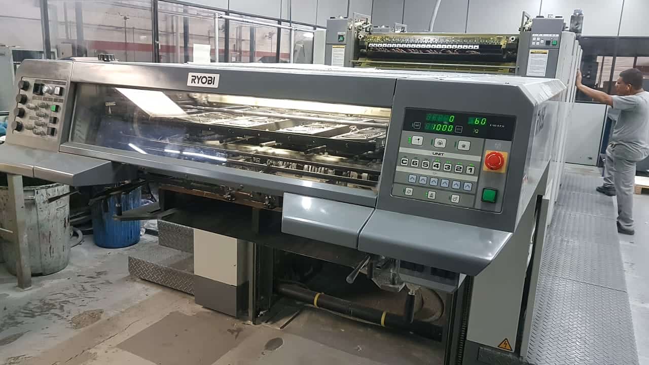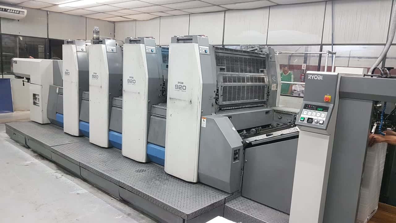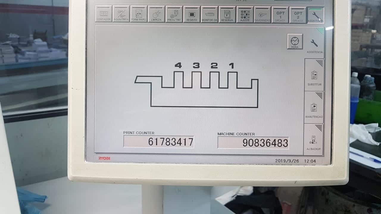Impressora offset usada, marca Ryobi, modelo 924, ano 2011, 4 cores, formato 64 x 92 cm, equipada com PCS G console, CIP 3, SPECTRO PDS E, SAPC – troca de chapas semi-automática, molha Ryobimatic com geladeira Technotrans, lavadores automáticos, saida alta., em produção.