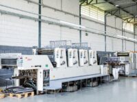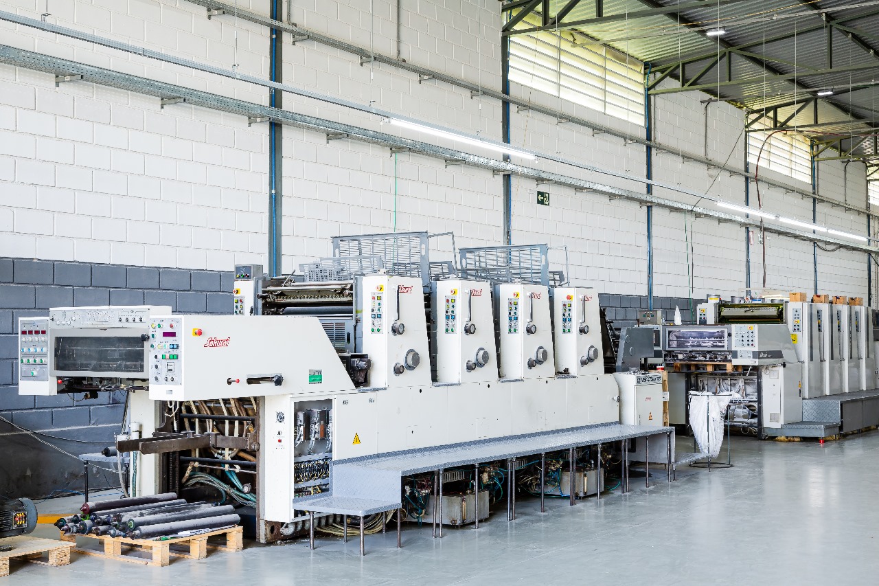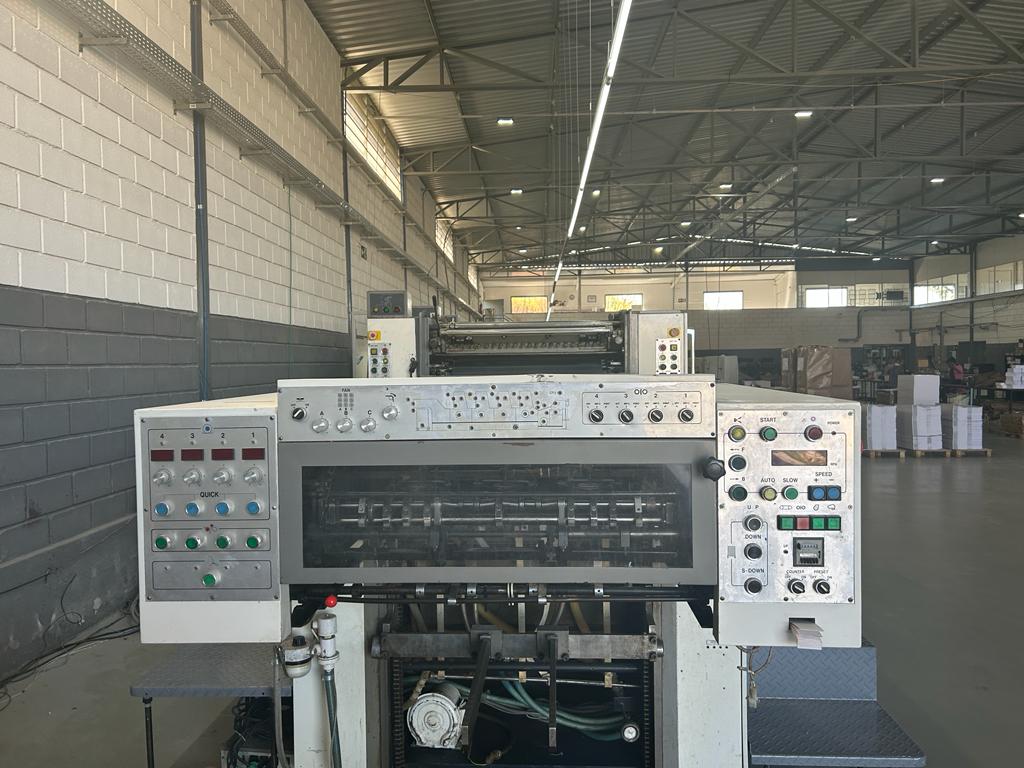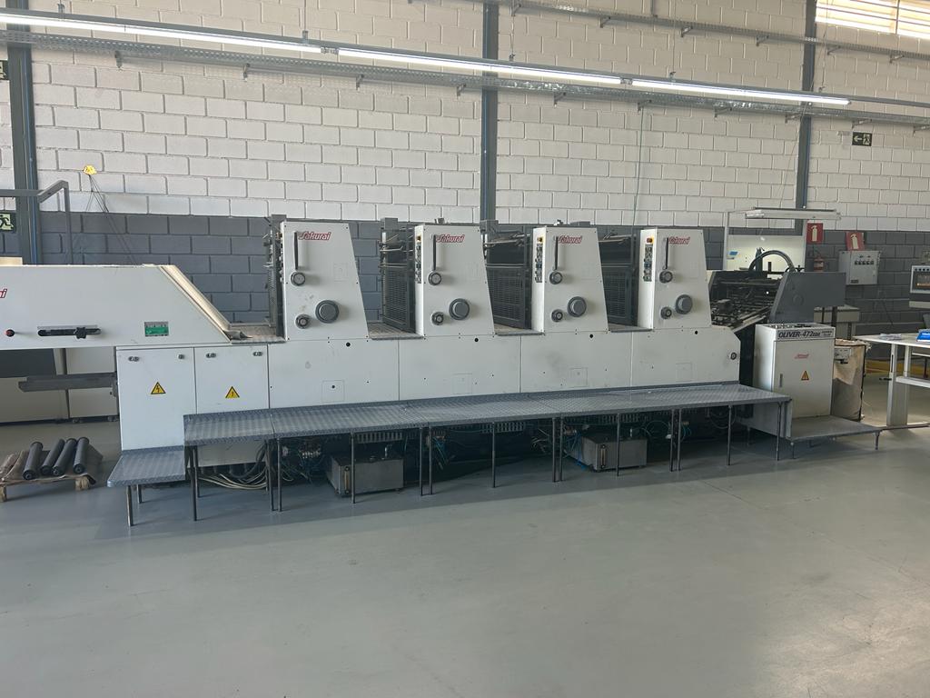 Impressora offset usada, marca Sakurai, modelo 472 ED, ano 1998, 4 cores, formato 52 x 72 cm, equipada com controles de tinteiros e registros, troca de chapas (Autoplate), molha à álcool, velocidade de 12.000 folhas/h, em produção.