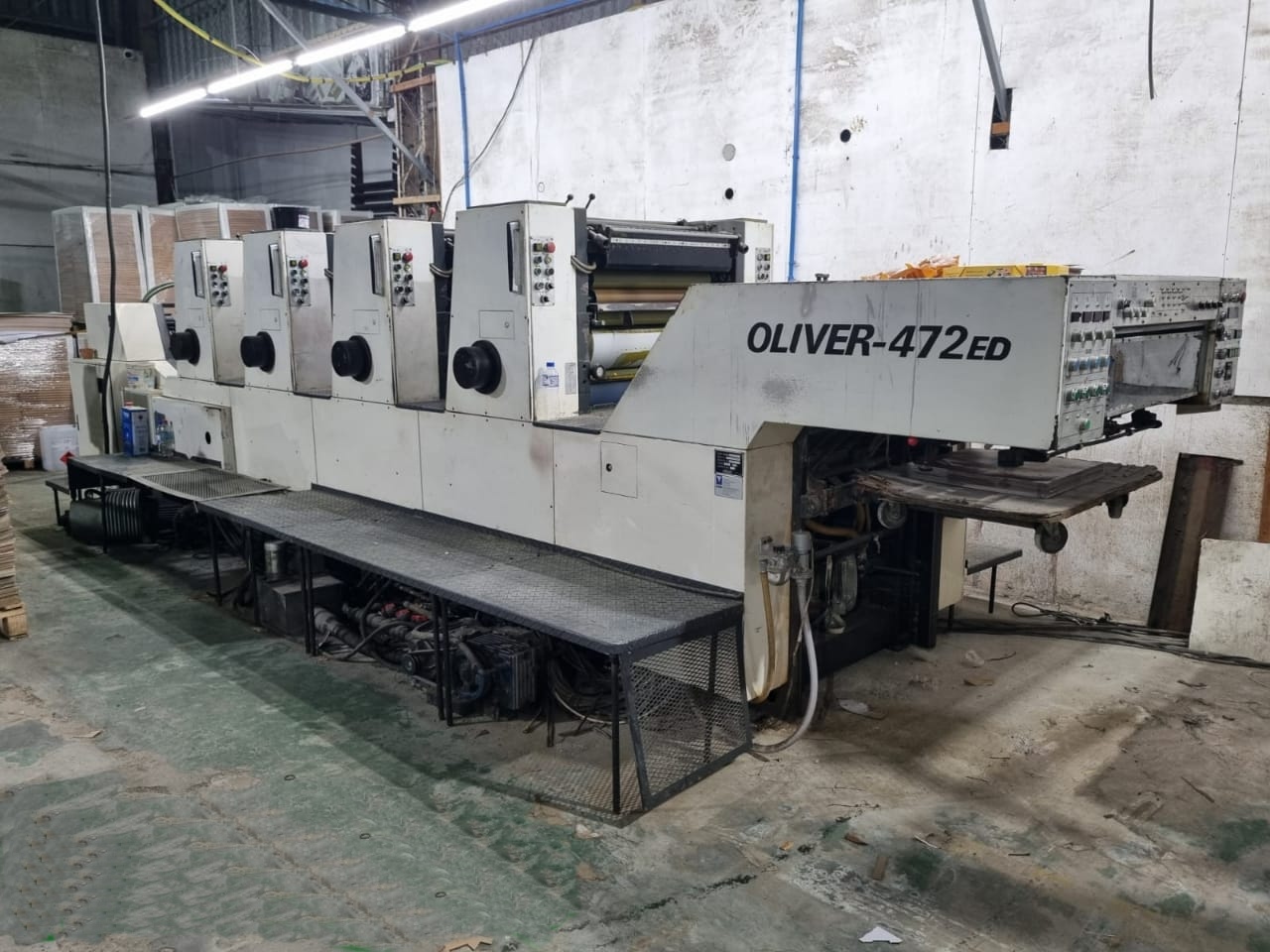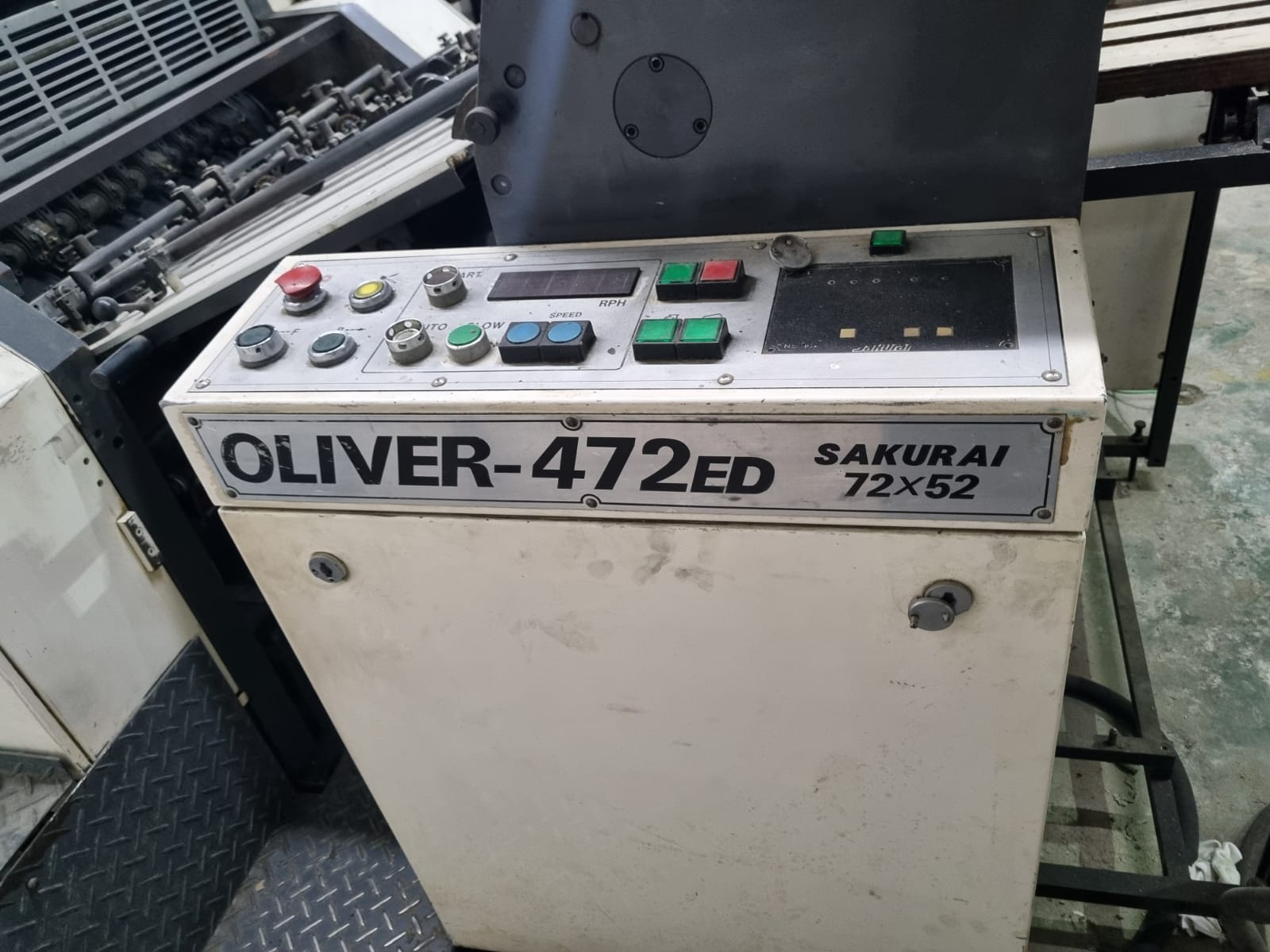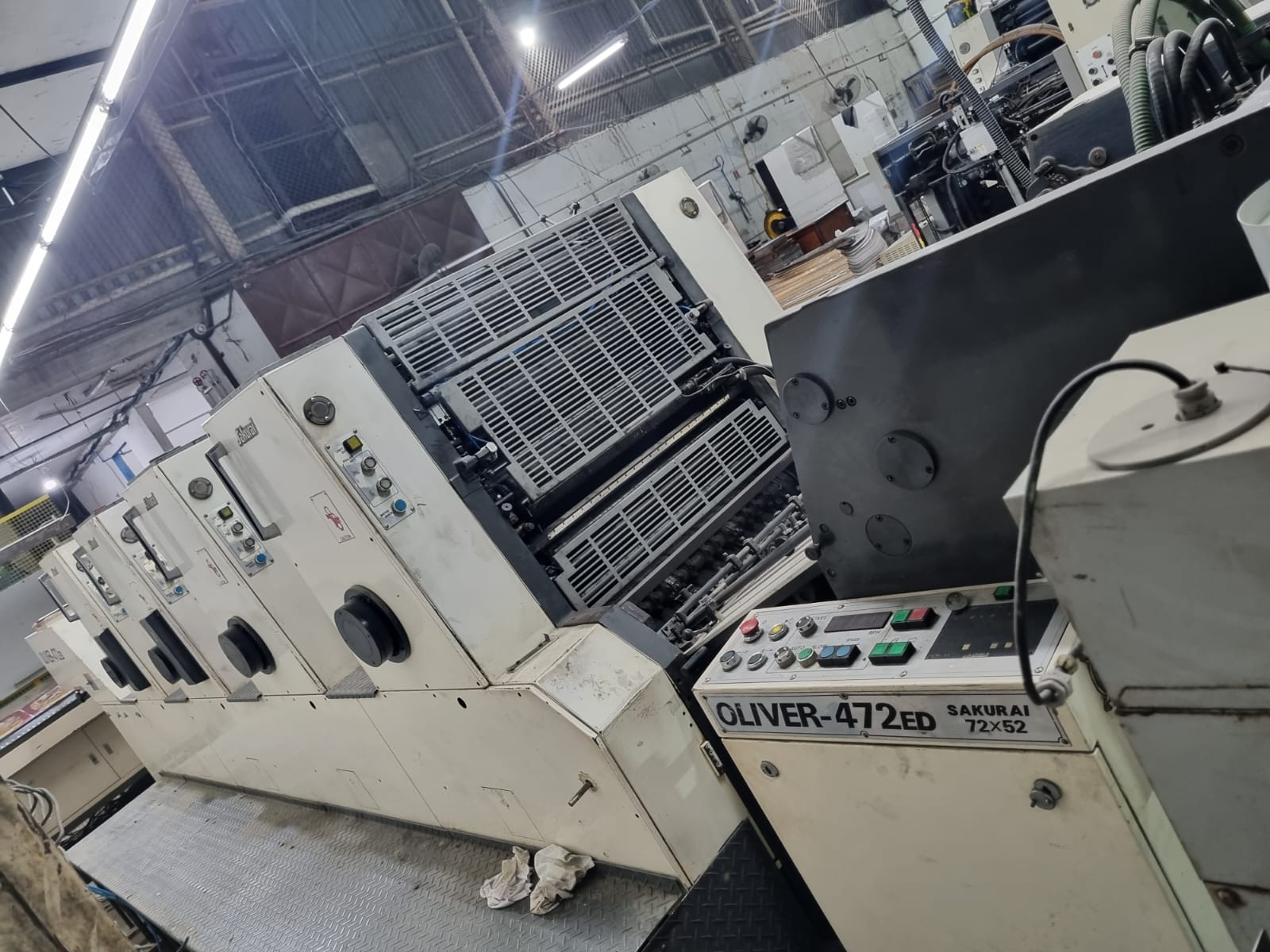 Impressora offset usada, marca Sakurai, modelo 472 ED, ano 1991, 4 cores, formato 52 x 72 cm, equipada com console para controles de tinteiros e registros, troca de chapas (Autoplate), molha à álcool, velocidade de 12.000 folhas/h, em produção.